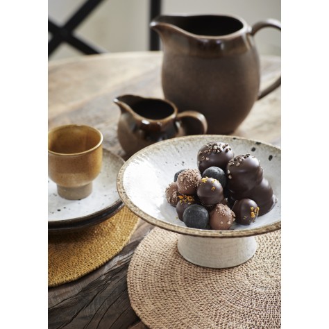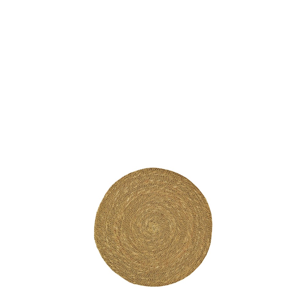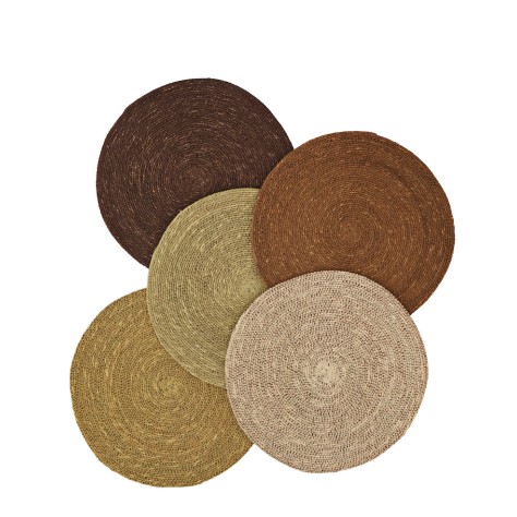 Sets de table ronds en matière naturelle aux couleurs douces.
