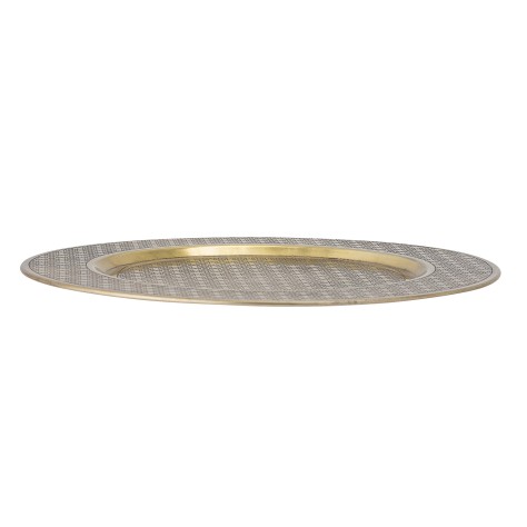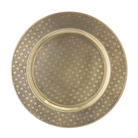 Un magnifique plateau en métal doré, gravé de motifs. Posez-y des bougies ou des petites boites, il donnera un ton très chaleureux et ethnique à votre salon. Il est aussi prévu pour le contact alimentaire.