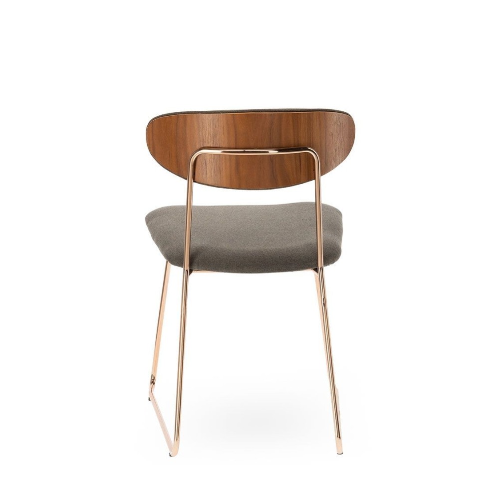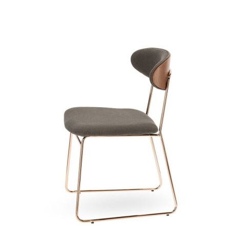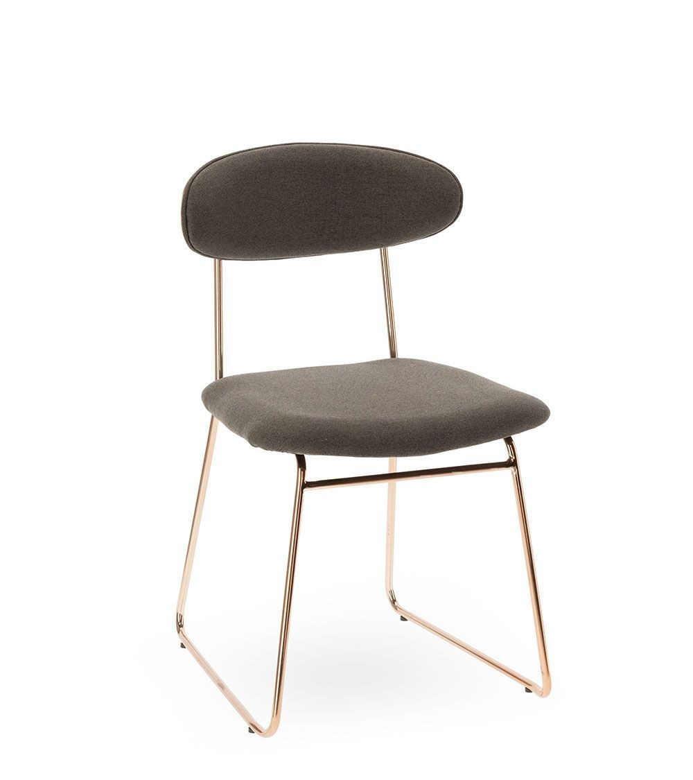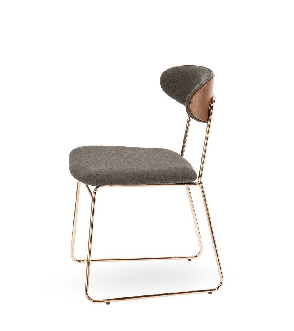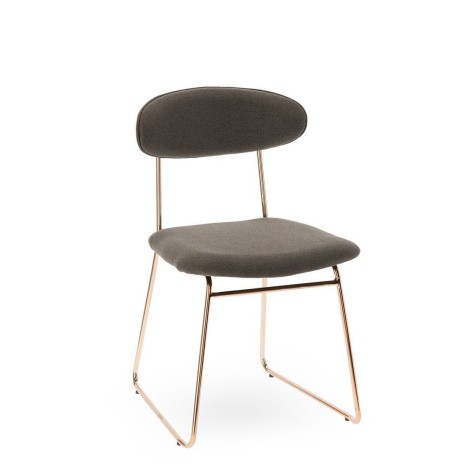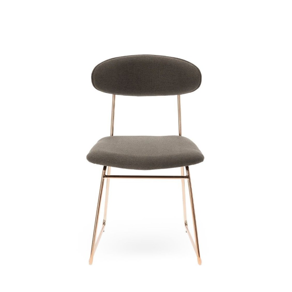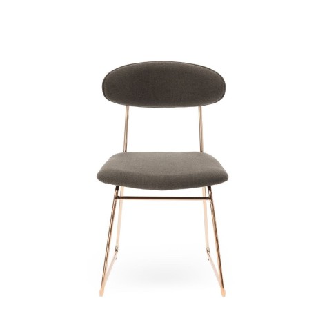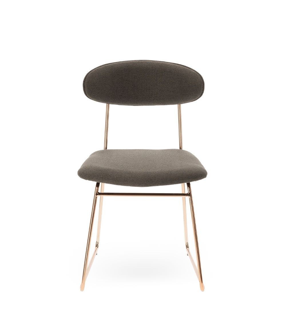 Chaise de table pour votre salle à manger ou pour votre bureau. Confort et élégance pour cette chaise en tissu au look design rétro. Une pièce intemporelle à jouer en uni ou en mix couleur ! Le petit plus qui fait sa différence : sa finition cuivre brossé.
