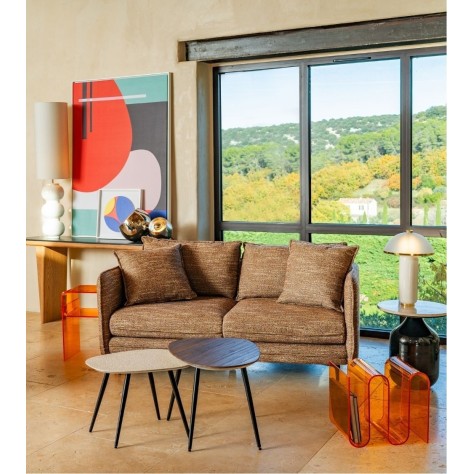 Canapé 2 places, 164 x 91 x H85 cm. Compact et cosy pour les petits comme les grands espaces. Confort mousse recouvert d'un tissu polyester chiné.