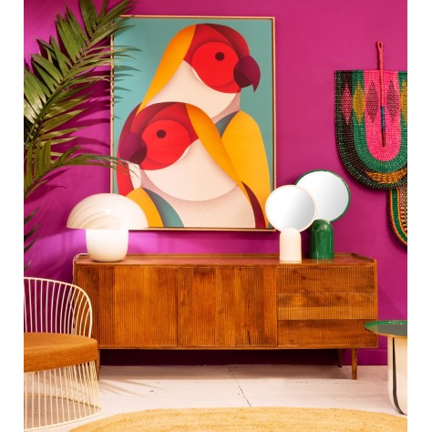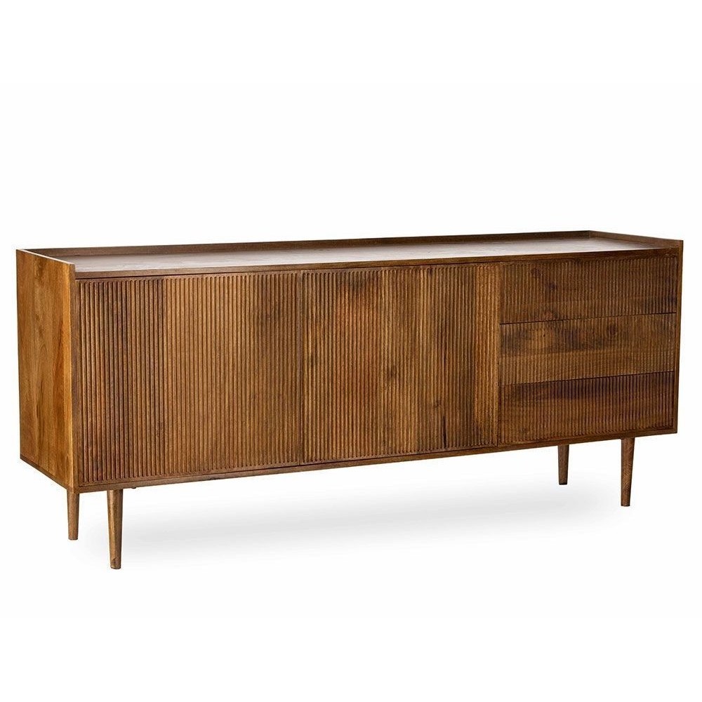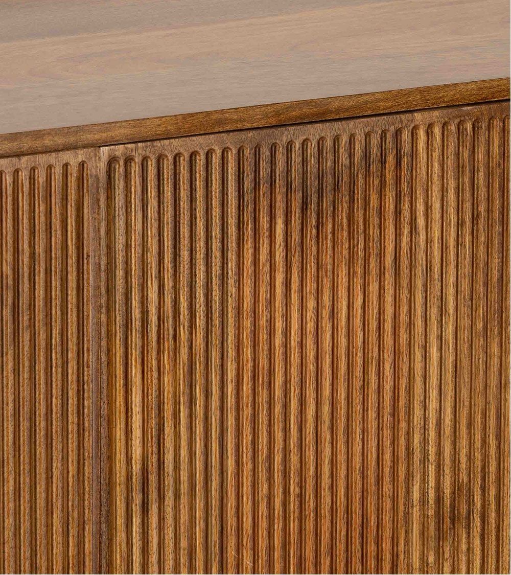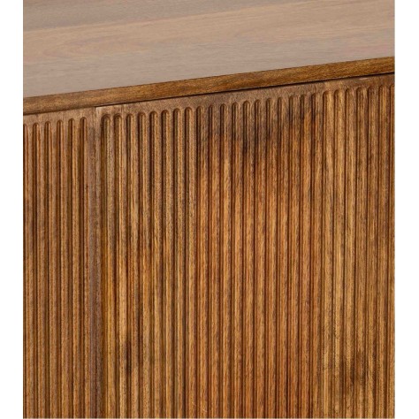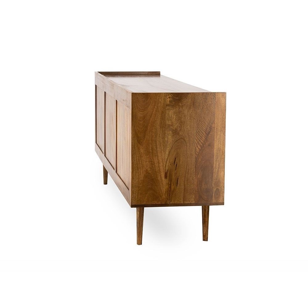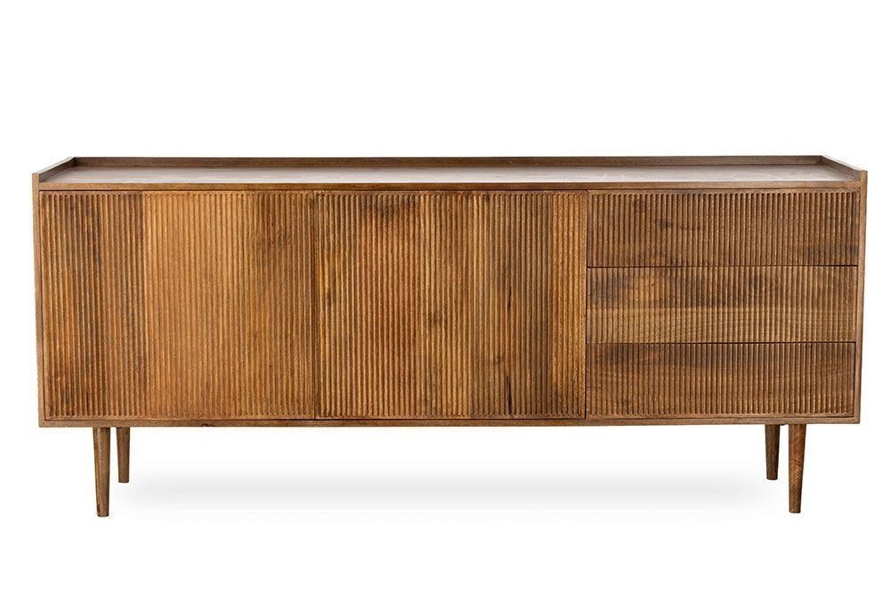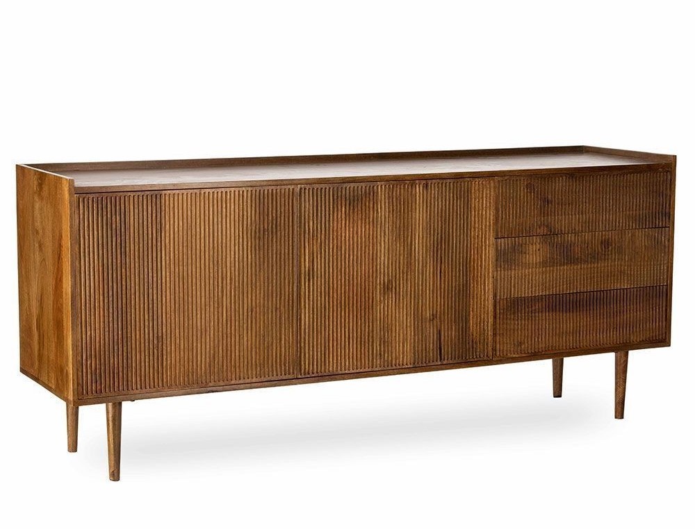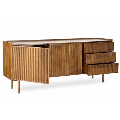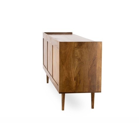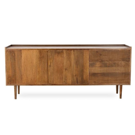 Buffet en manguier. Il est doté de 2 portes / 3 tiroirs, fermeture par système push. Existe en bout de canapé / Table de chevet et meuble TV. Chic, bohème et ethnique. De fabrication artisanale, chaque pièce est unique.