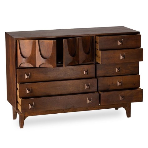 Rétro et vintage, cette commode multi-tiroirs aura sa place dans votre chambre ou même dans une pièce de vie pour du rangement. Il est composé de 8 tiroirs et 2 portes / 1 niche. Ce meuble a été réalisé de manière artisanale, chaque pièce est unique !
