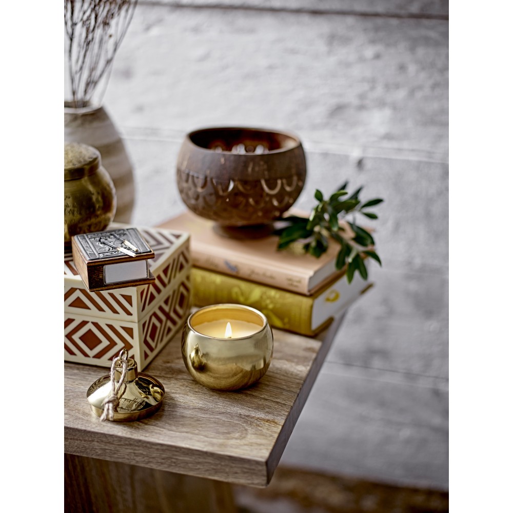 Bougie parfumée à base de cire de soja dans un magnifique récipient en métal doré. Notes fruitées de nectarine et de prune noire ainsi que de rose turque, de feuille de violette, de bois crémeux et de musc.