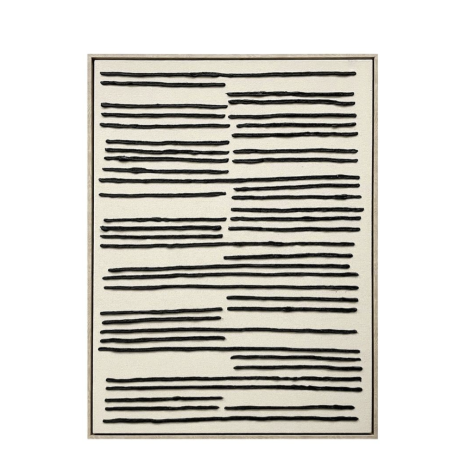 Une partition visuelle, un rythme graphique, une connexion brute. Faisant écho à notre tableau Dédale, la toile Circuit poursuit l'exploration de la matière avec un nouveau langage. Sur le même fond texturé blanc cassé, des lignes horizontales noires sont appliquées en relief, mais se brisent et s'agencent ici en blocs distincts. Cette composition structurée crée une impression de flux, de rythme et de modernité. Tel un circuit imprimé artisanal ou une partition de musique abstraite, cette œuvre joue avec les pleins, les vides et la matière. La texture en relief accroche la lumière, donnant vie et profondeur à l'ensemble, tandis que la caisse américaine en bois clair apporte une touche de chaleur naturelle et authentique.