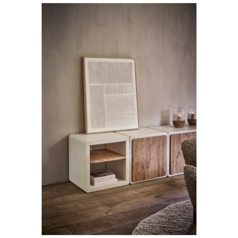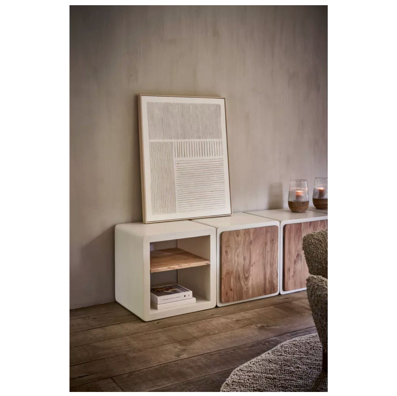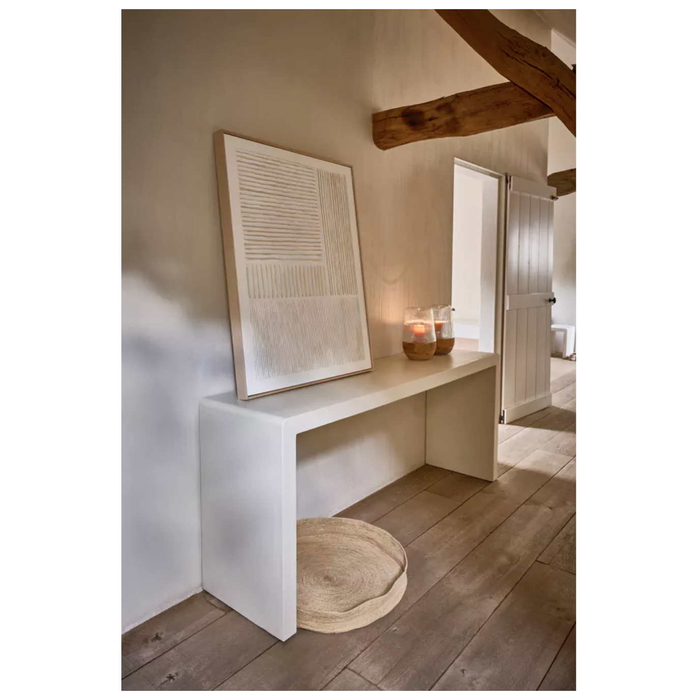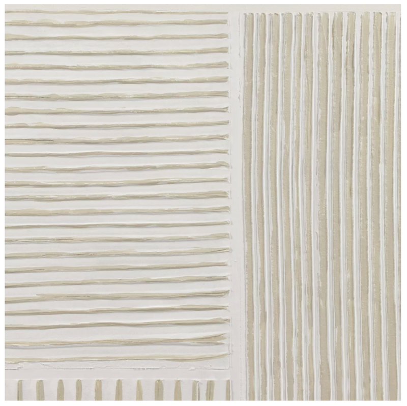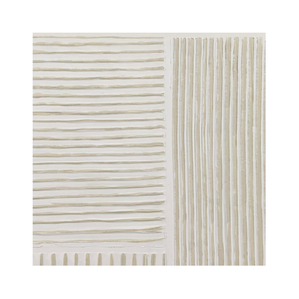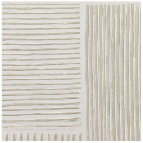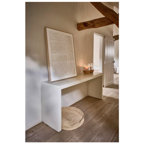 Une ode à la simplicité, à la lumière et à la matière. Le tableau BLANCHE de Pomax est une pièce d'art minimaliste qui captive le regard par sa richesse texturale. Entièrement monochrome, cette œuvre tire sa force de son travail en relief : la matière est appliquée en épaisseur puis gravée à la main pour créer des motifs de lignes parallèles, tantôt horizontales, tantôt verticales. Ce jeu de stries crée un rythme visuel et un dialogue fascinant avec la lumière, qui révèle de nouvelles ombres et de nouveaux détails tout au long de la journée. Encadré de bois de pin naturel, ce tableau apporte une présence apaisante et une touche de sophistication discrète.