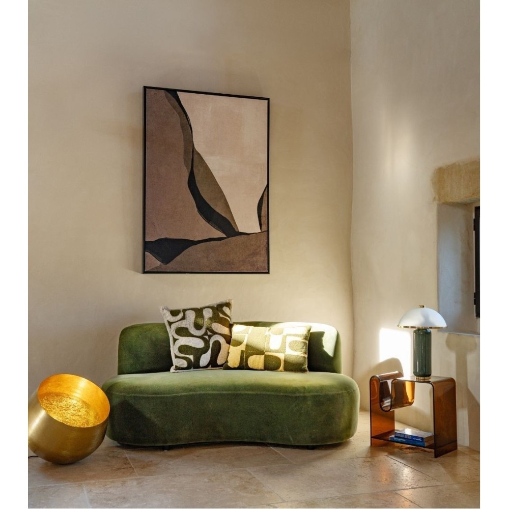 Ses dimensions spectaculaires en font la pièce maîtresse d'un salon ou d'un bureau. Son esthétique minimaliste est parfaite pour un intérieur contemporain et raffiné, associée à des meubles aux lignes épurées. Son inspiration tellurique et la douceur de son velours résonnent aussi avec un décor bohème, marié à du bois brut, du lin et de la céramique artisanale.