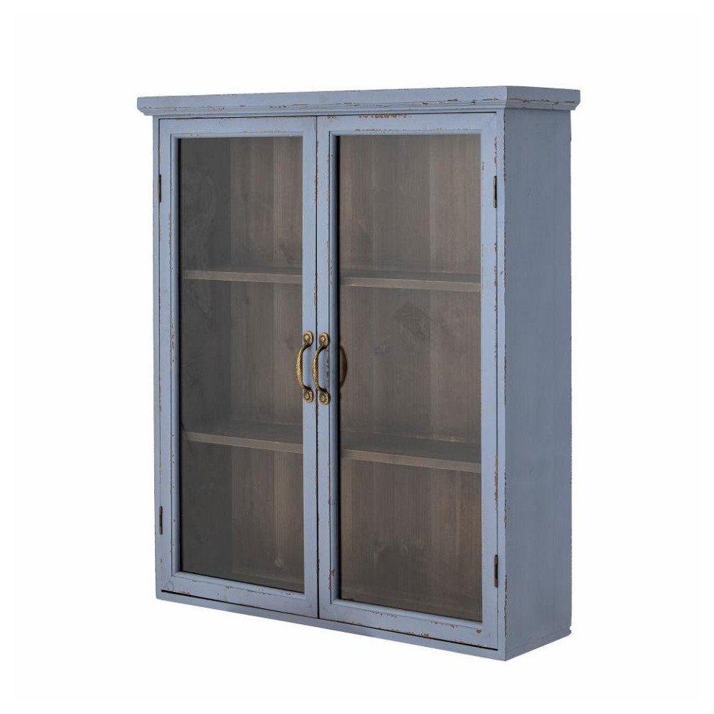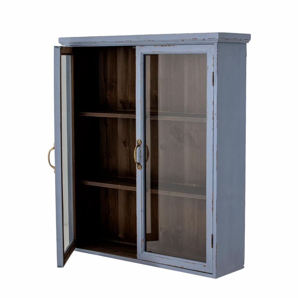Armoire bleue, 2 portes vitrées, fermeture magnétique. Effet vieilli
