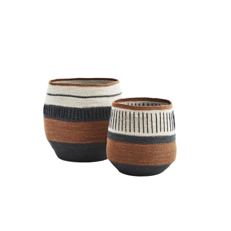 Paniers ronds en matière naturelle avec des rayures de couleurs coordonnées et douces.