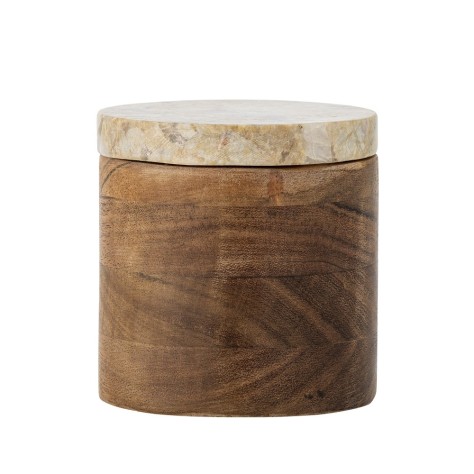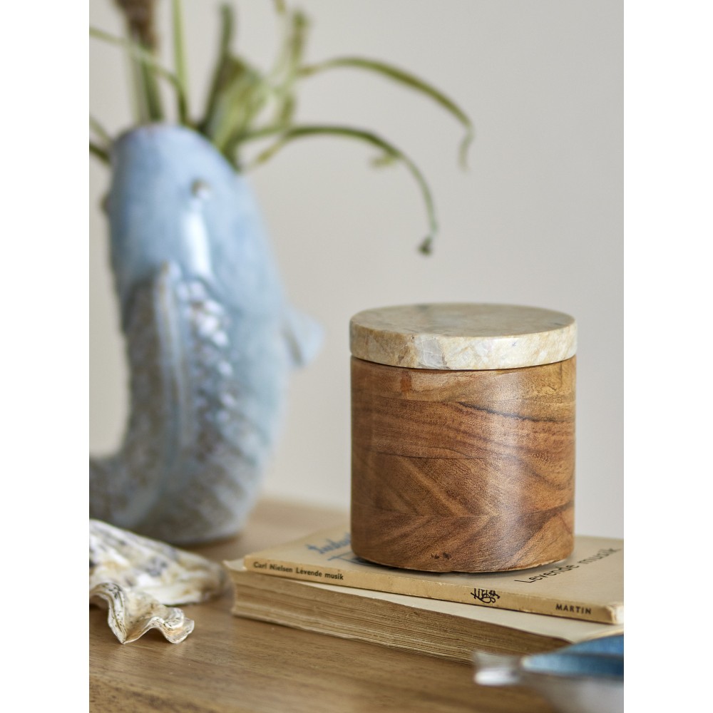 Cette boite est fabriquée en bois d'acacia certifié FSC avec un couvercle en marbre élégant. La combinaison du bois naturel et des motifs uniques du marbre rend chaque pot unique. Ce pot polyvalent est idéal pour ranger de petits objets comme des cotons ou des élastiques et constitue également un élément décoratif élégant pour votre intérieur.