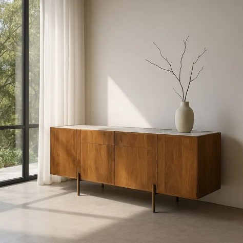 Ce meuble brille dans un environnement lumineux et peu encombré. Placez-le contre un mur aux teintes claires et neutres (blanc, craie, gris perle) pour mettre en exergue la chaleur du bois et la finesse de son piètement. Son design horizontal et bas le rend parfait comme meuble TV ou console multimédia dans un salon contemporain, créant une ligne d'horizon apaisante. Il sera également magnifique sous une grande fenêtre, comme sur la photo, où la lumière naturelle viendra caresser son plateau en pierre.