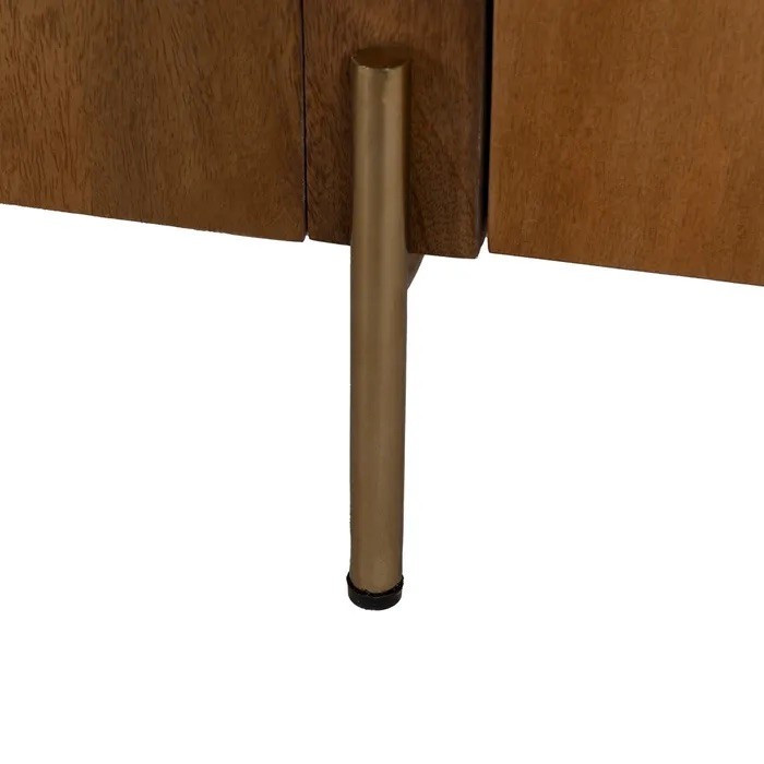 Ce buffet bas incarne une élégance minimaliste et un design raffiné. Il se distingue par son alliance de matières nobles : une structure en bois aux tons chauds, rehaussée par un plateau contrastant en marbre blanc. Sa silhouette épurée et ses lignes droites sont soutenues par un piètement fin en métal doré, qui lui confère une légèreté presque aérienne. D'inspiration mid-century moderne, ce meuble fonctionnel est une pièce maîtresse sophistiquée, parfaite pour un intérieur contemporain et chic.