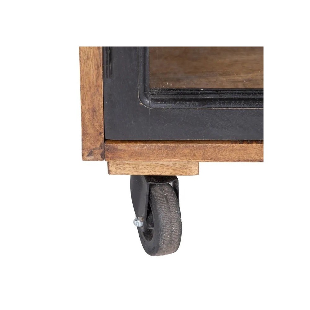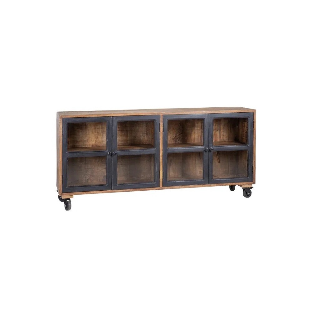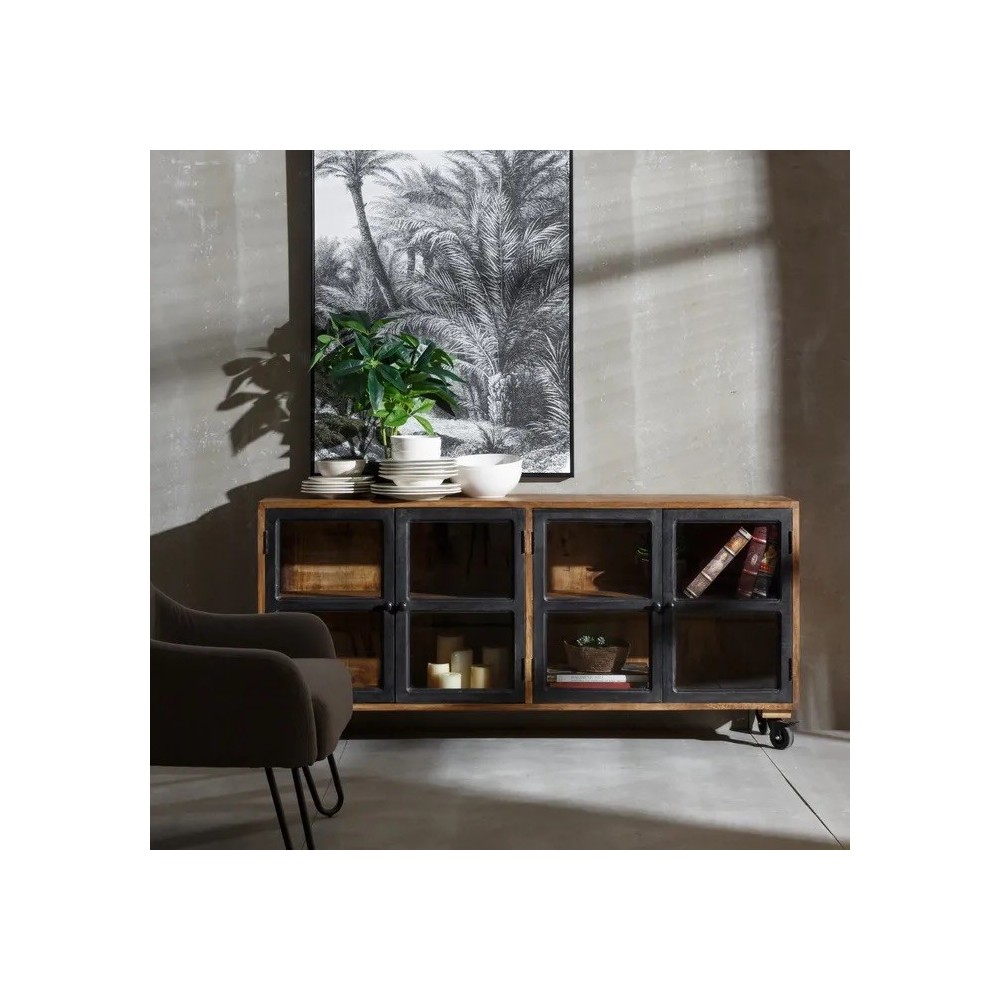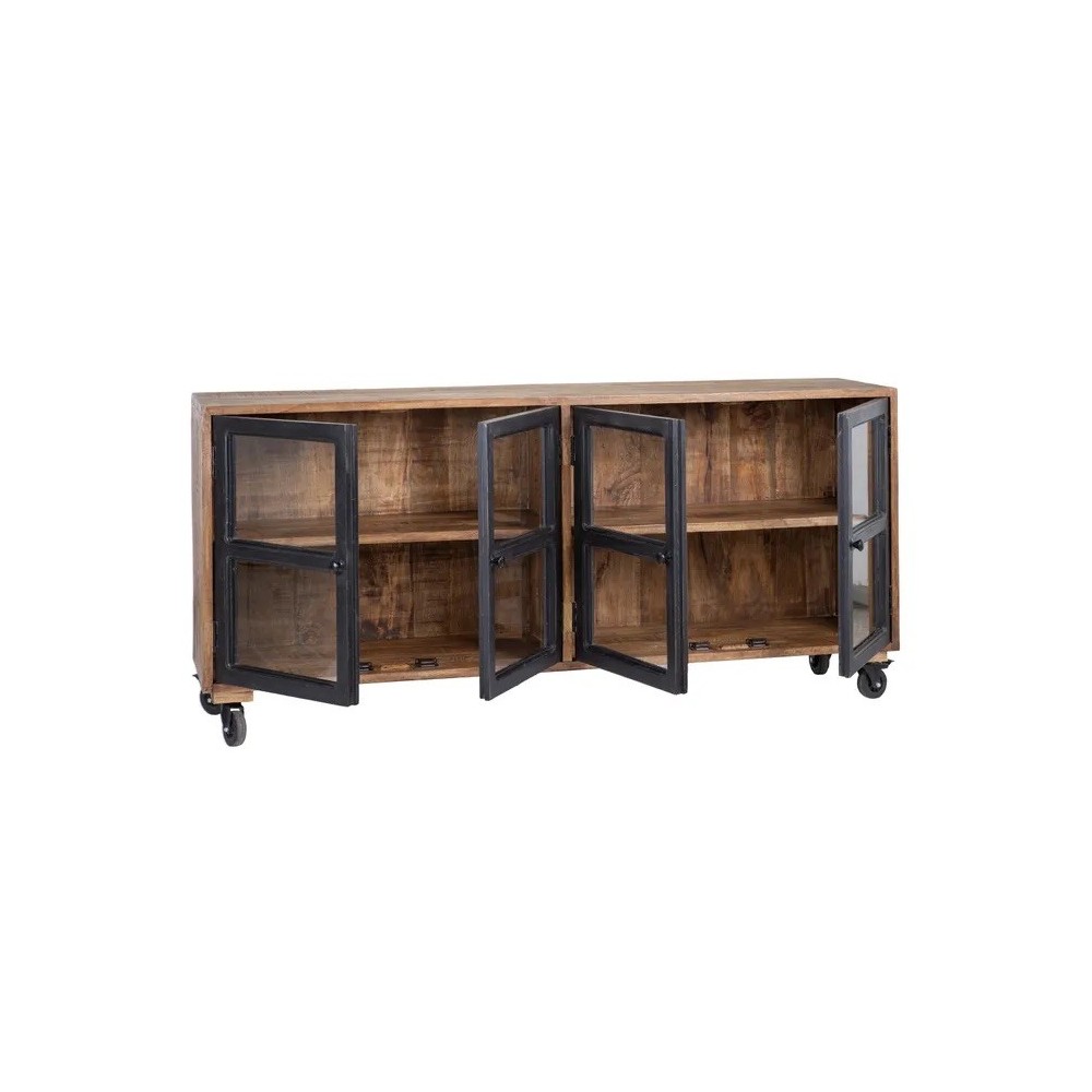 Buffet en bois de manguier sur roulettes avec 4 portes vitrées transparente