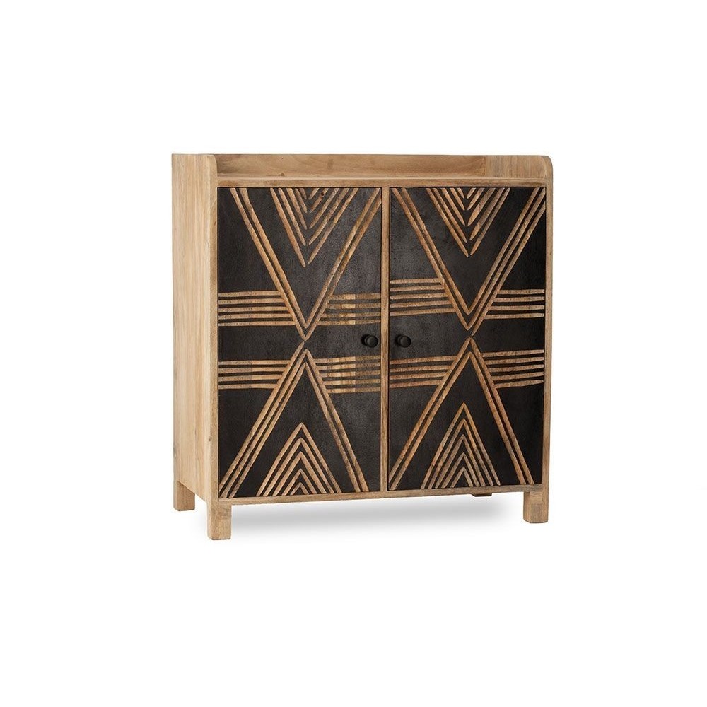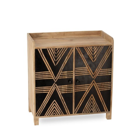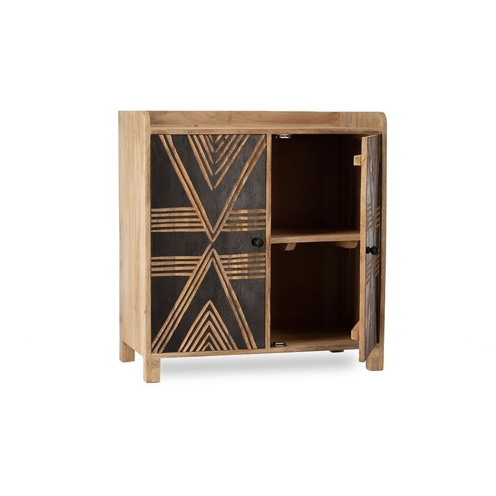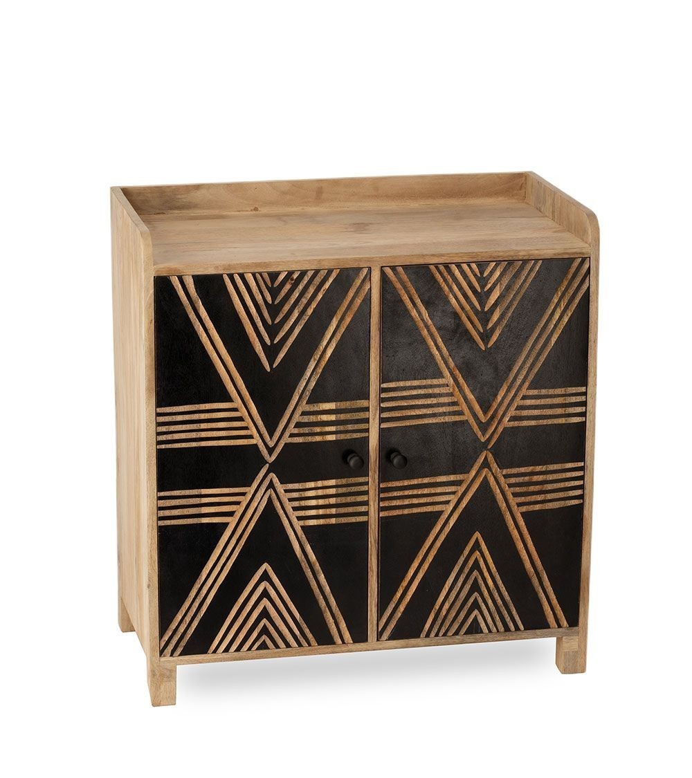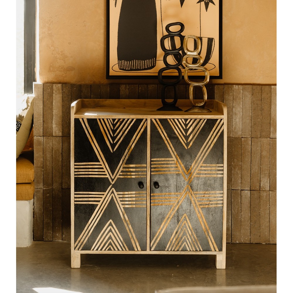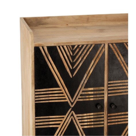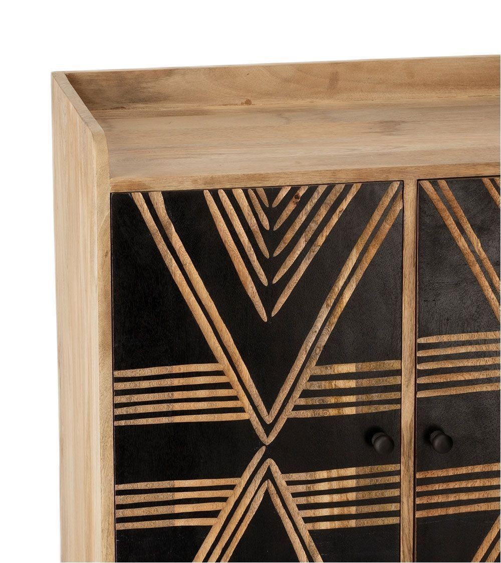 Pièce de caractère par excellence, le buffet Toteng est un meuble qui ne laisse personne indifférent. Sa structure en bois de manguier massif révèle la chaleur et l'authenticité d'une matière noble, tandis que sa façade noire crée un contraste saisissant. Les portes sont minutieusement gravées à la main, laissant apparaître des motifs géométriques d'inspiration tribale qui jouent avec la lumière et donnent un rythme visuel unique à votre décoration. Ce meuble est la rencontre parfaite entre l'artisanat du monde et un design contemporain et audacieux. Derrière ses deux portes, il cache un bel espace de rangement pour votre vaisselle, vos livres ou votre linge de maison.