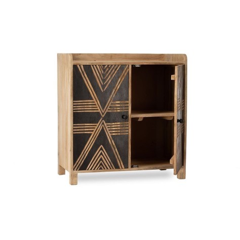 Le buffet Toteng est idéal pour dynamiser une pièce. Dans une entrée, il créera une première impression inoubliable. Dans un salon, placez-le sous un grand miroir rond pour adoucir ses lignes graphiques ou utilisez-le comme un bar d'appoint original. Pour accentuer son côté ethnique chic, posez dessus un vase dame-jeanne, quelques beaux livres et des objets en laiton doré. Il s'intègre aussi bien dans un décor bohème, entouré de plantes vertes et de tapis berbères, que dans un intérieur plus urbain où sa forte personnalité contrastera avec des murs blancs épurés.