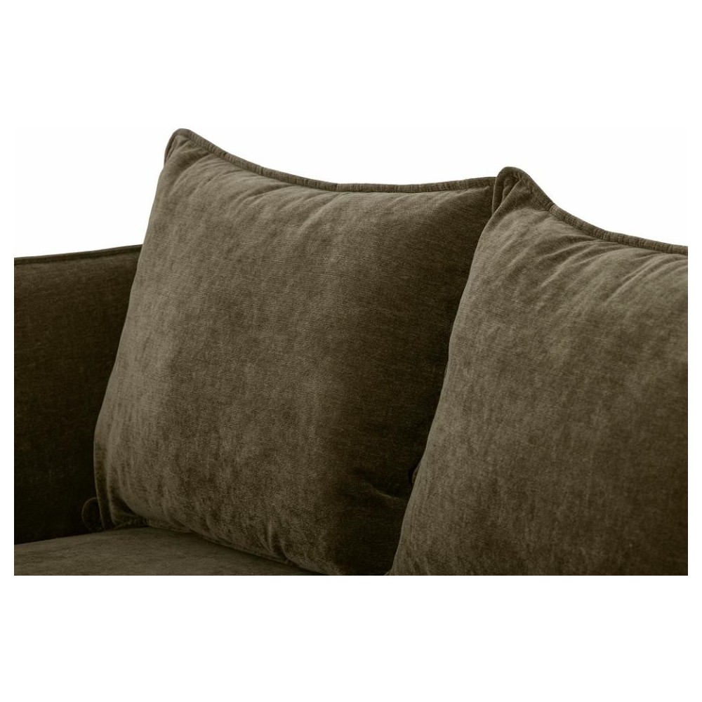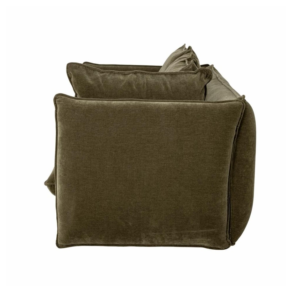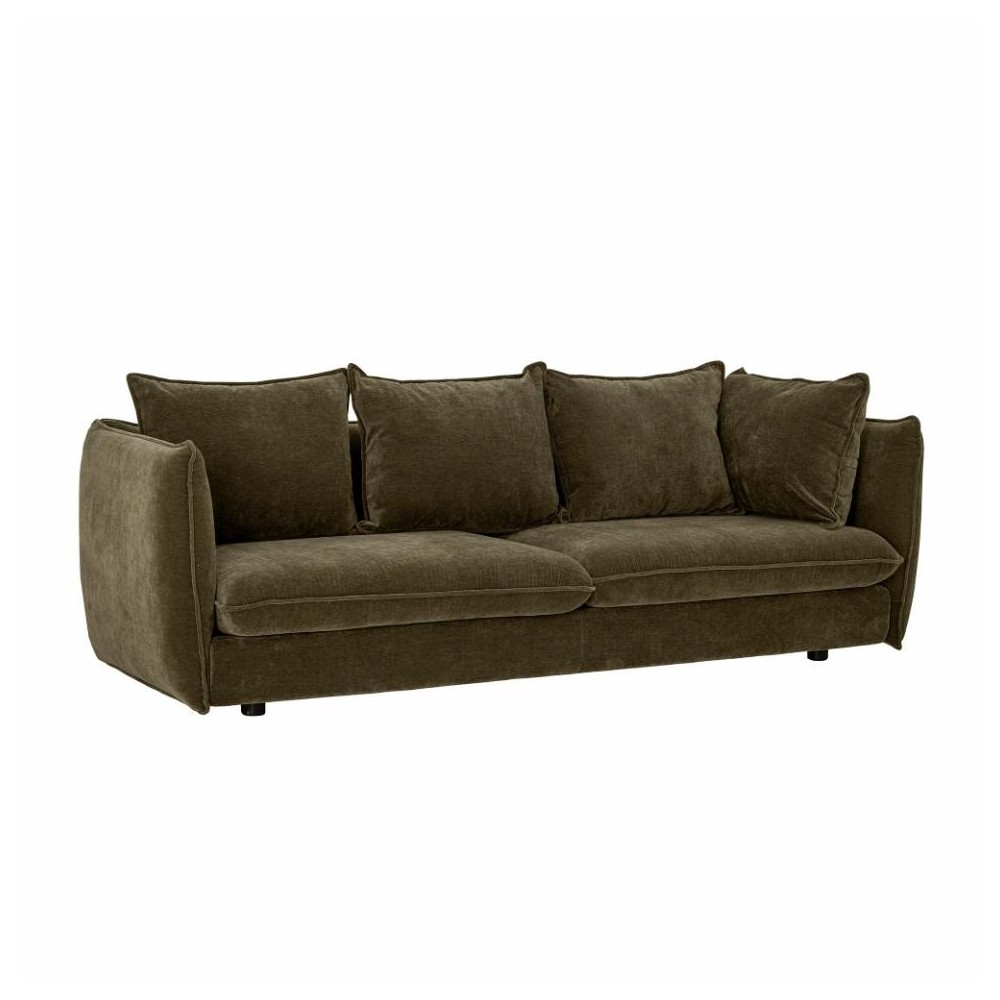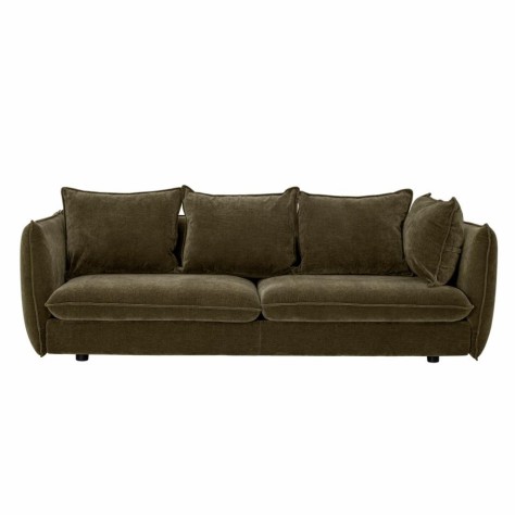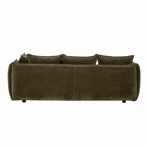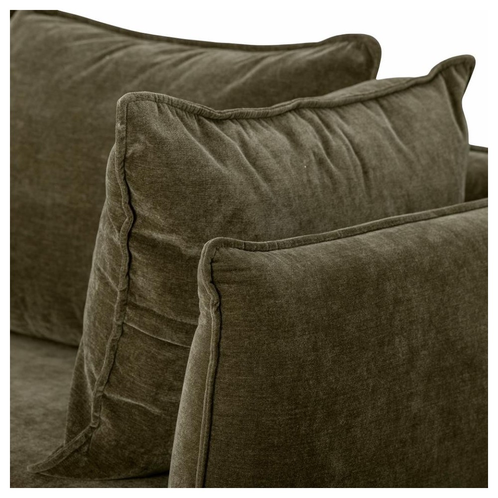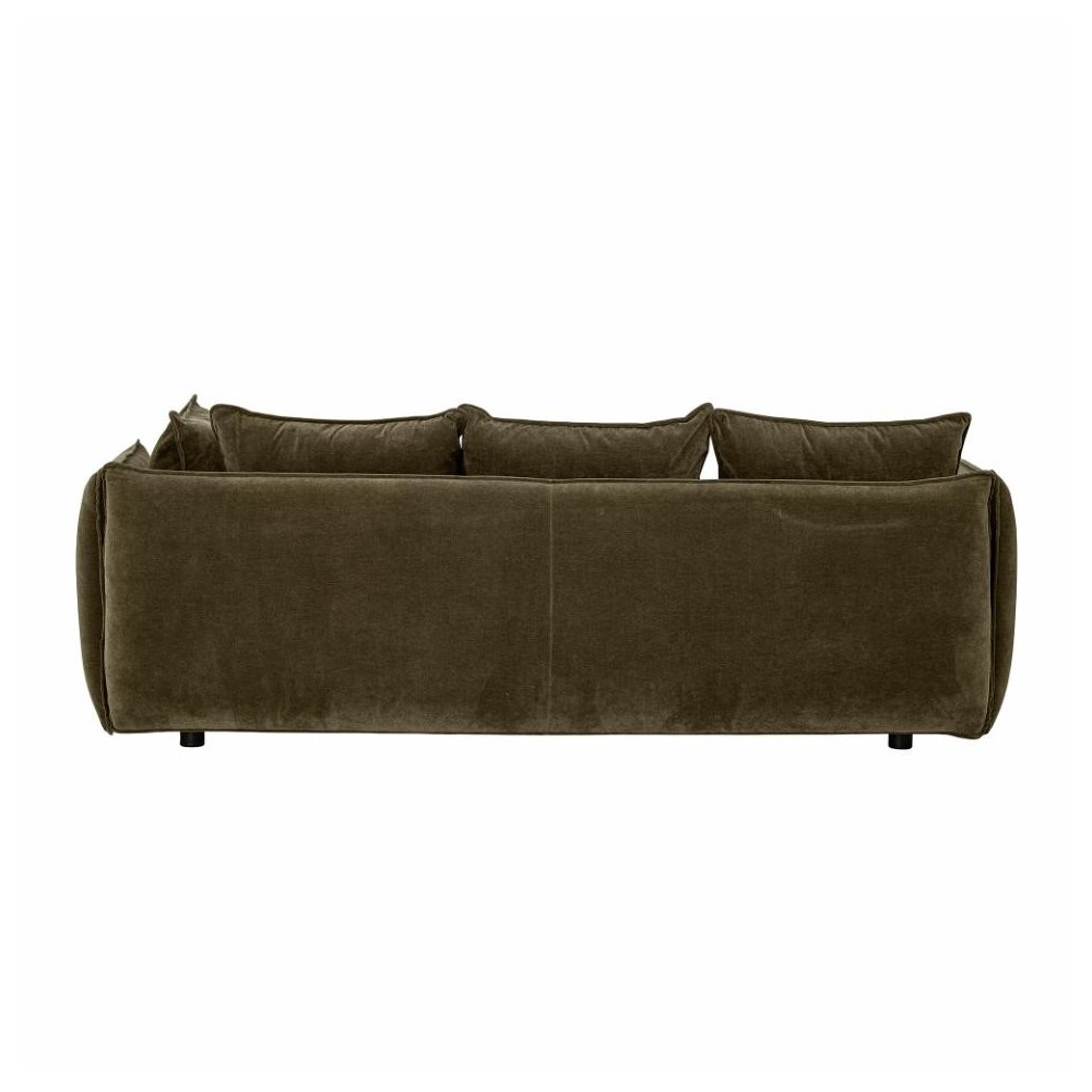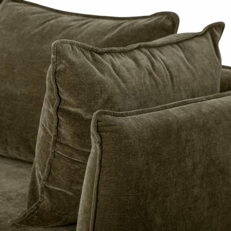 Canapé en velours doux, couleur verte foncée. Il est composé de deux coussins d'assise et quatre coussins de dossier une assise extra confortable. Son revêtement est conçu en polyester recyclé.