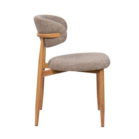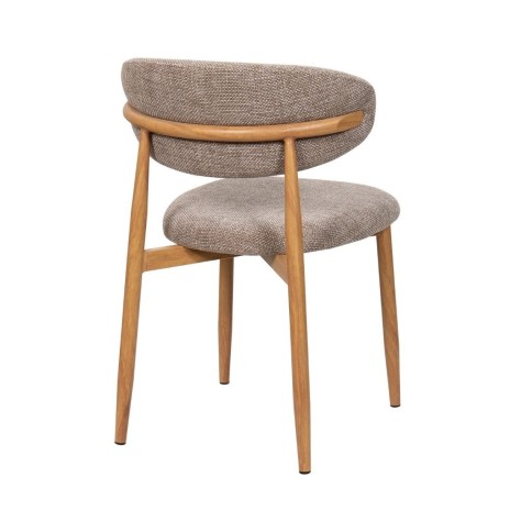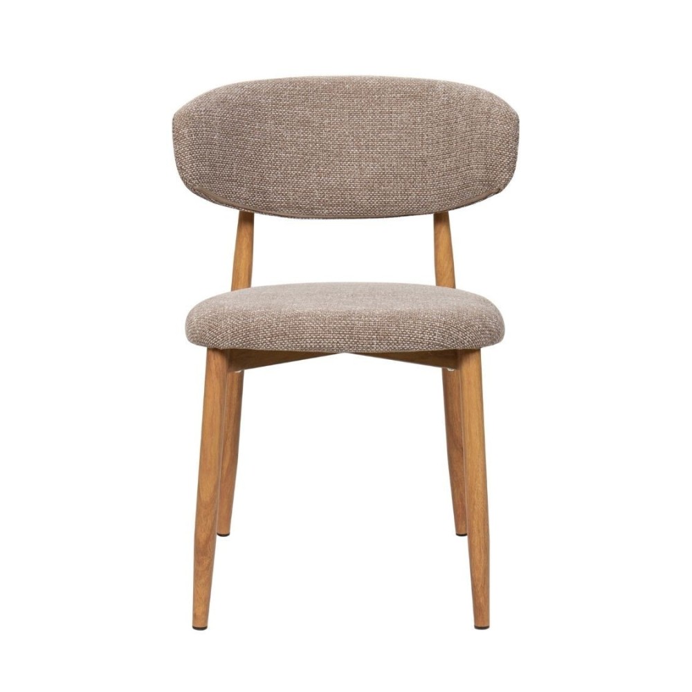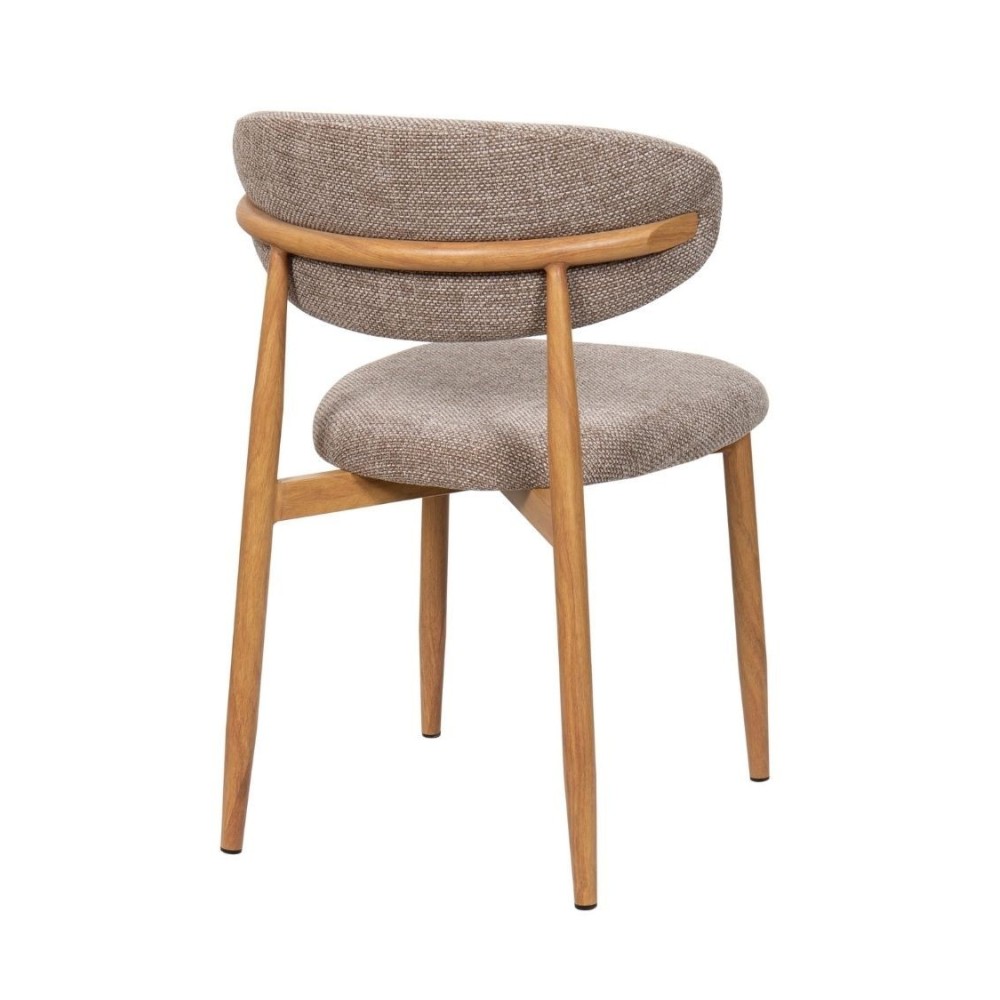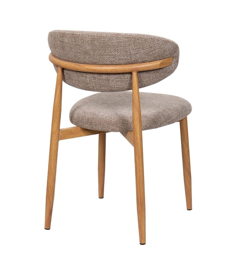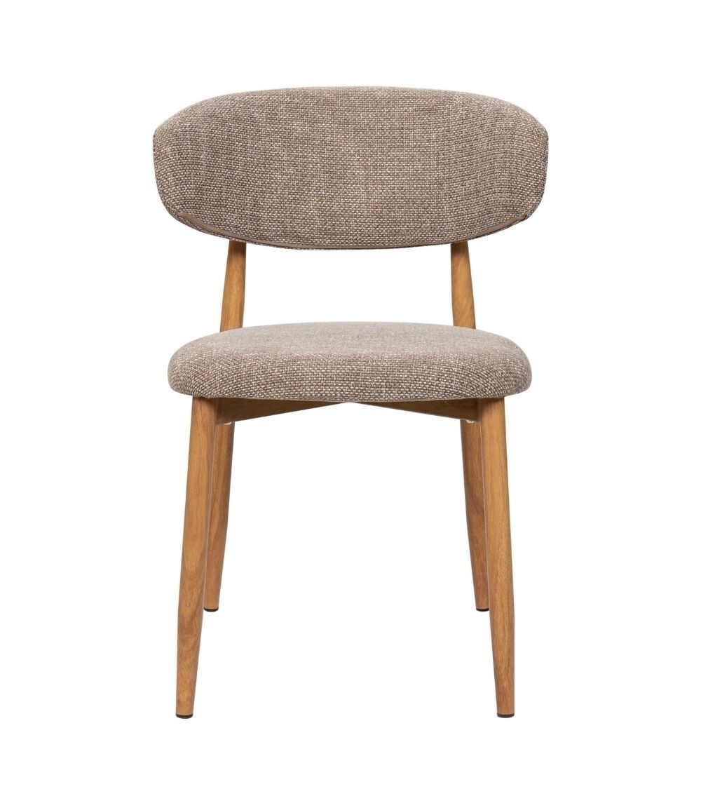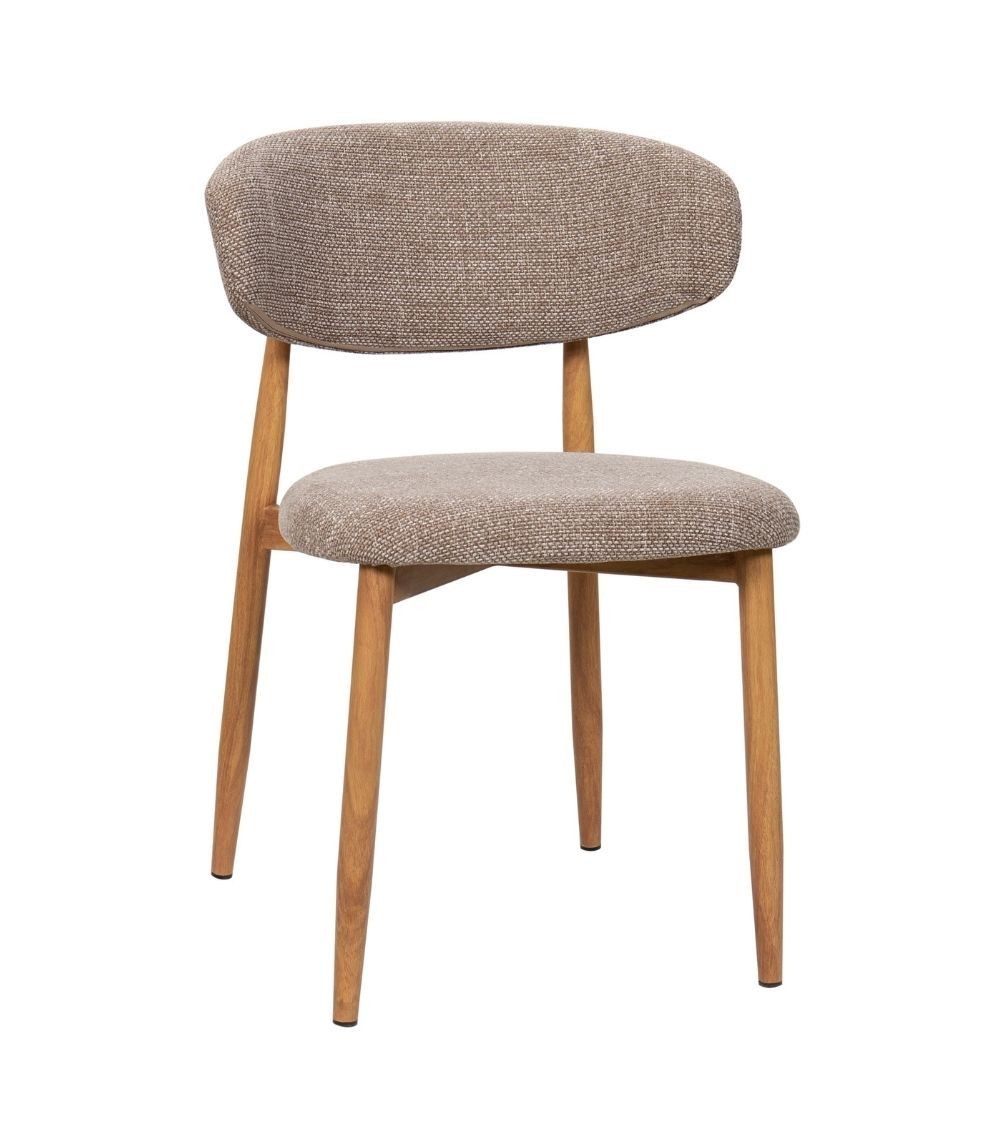 Élégante chaise de style scandinave. Son revêtement en tissu taupe et ses pieds en métal effet bois naturel apportent une touche chaleureuse. Avec son assise confortable et son dossier arrondi, elle allie design épuré et confort pour tout intérieur moderne.