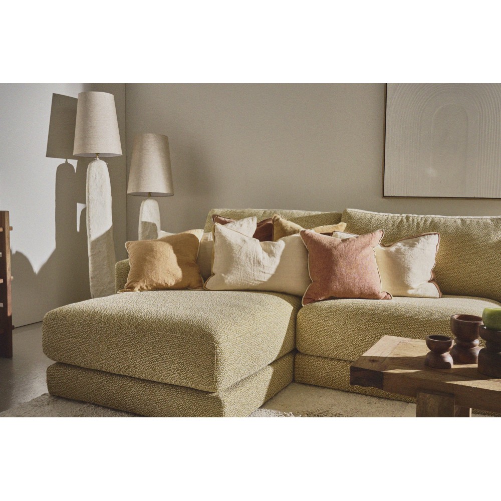 Les coussins Opposites mesurent 45x45 cm et présentent deux couleurs et textures différentes : lin chambrray au recto et velours de coton au verso. Son intérieur en plume vous assure gonflant, moelleux et grand confort.