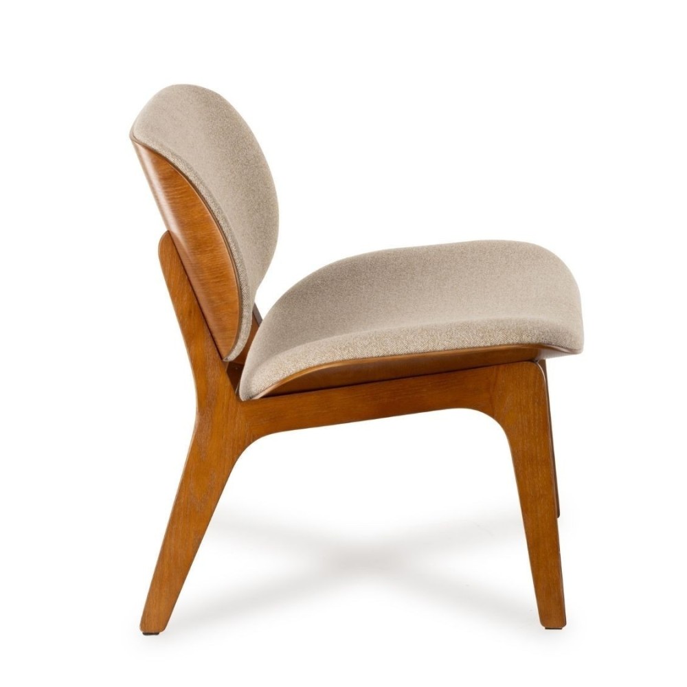 Magnifique fauteuil au look vintage gâce au mélange de son revêtement en tissu chiné gris clair et de sa structure en bois chêne contraplaqué brun doré. Il prend peu de place et trouvera sa place dans votre salon, à coté de la table basse, ou dans un coin près d'une bibliothèque.
