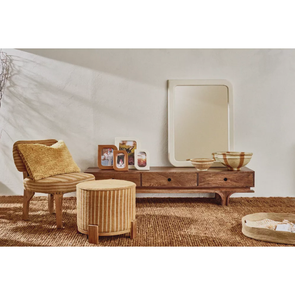 D'inspiration ethnique, cette superbe collection Brindisi se distingue par son revêtement en tissu Kilim coloré. Composée d'un banc, de deux fauteuils, deux repose-pieds et deux coussins, cette collection est une véritable invitation au voyage qui mixe habilement influences exotiques et design contemporain.
