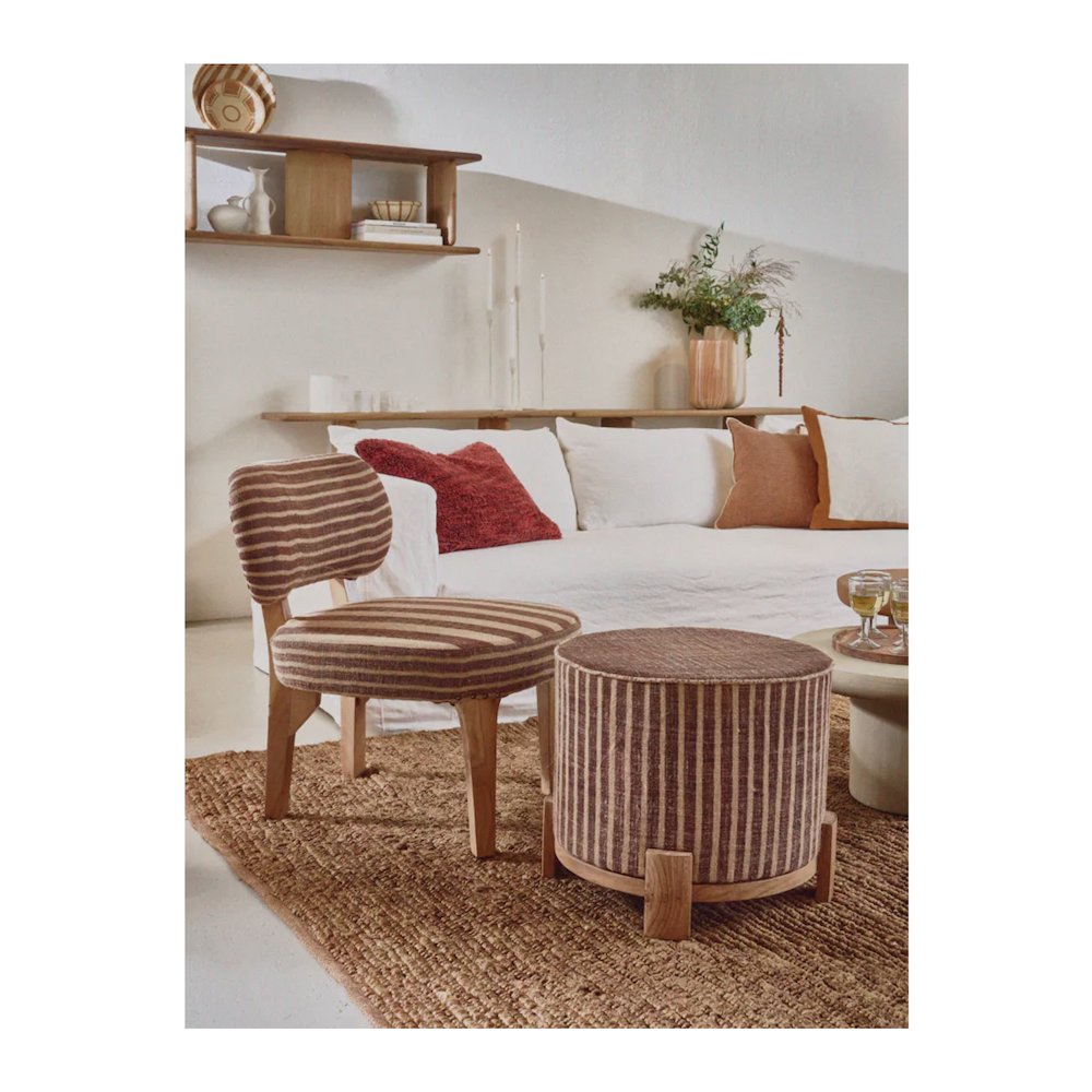 D'inspiration ethnique, cette superbe collection Brindisi se distingue par son revêtement en tissu Kilim coloré. Composée d'un banc, de deux fauteuils, deux repose-pieds et deux coussins, cette collection est une véritable invitation au voyage qui mixe habilement influences exotiques et design contemporain.