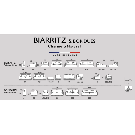 En terme de design, Biarritz et Biscarrosse ont la même structure. La différence réside dans le dossier : multi-coussins pour Biarritz et deux coussins placés pour Biscarrosse. Biarritz se décline également version tapissier, il s'appelle Blagnac.