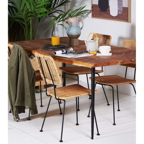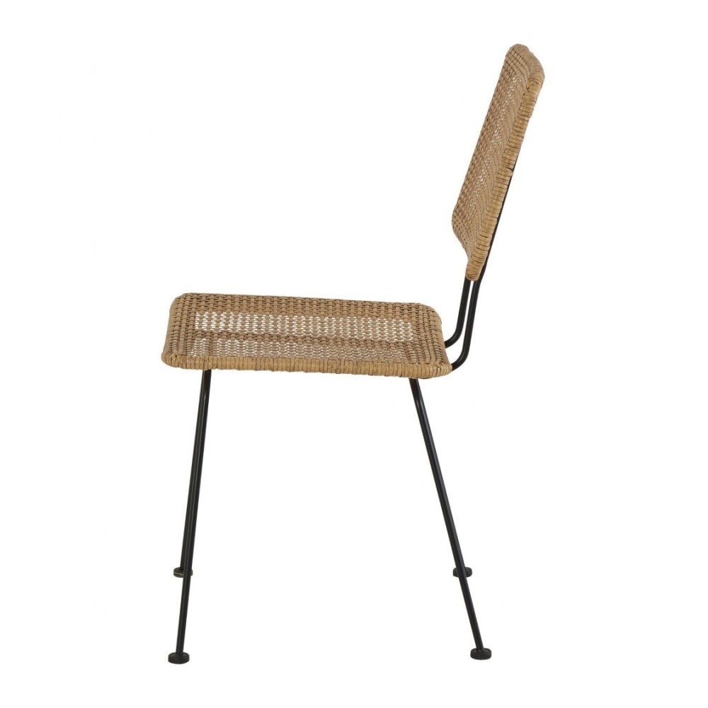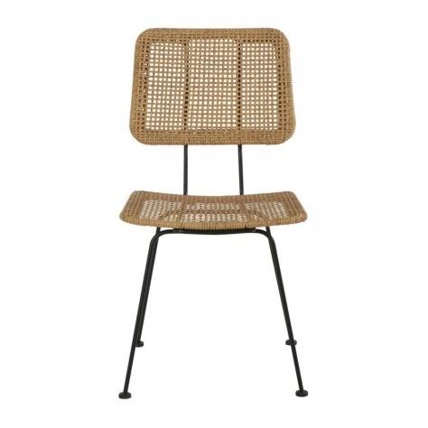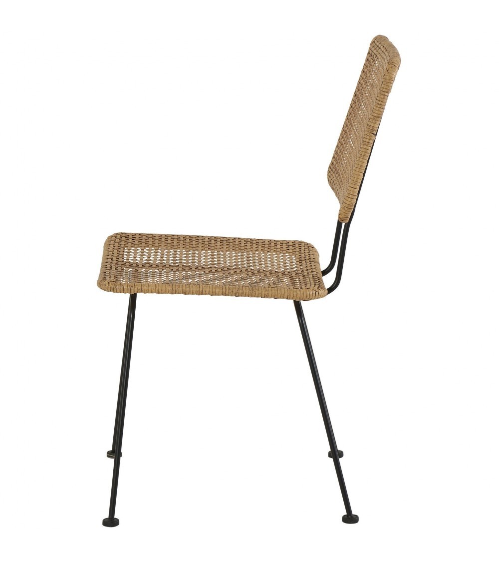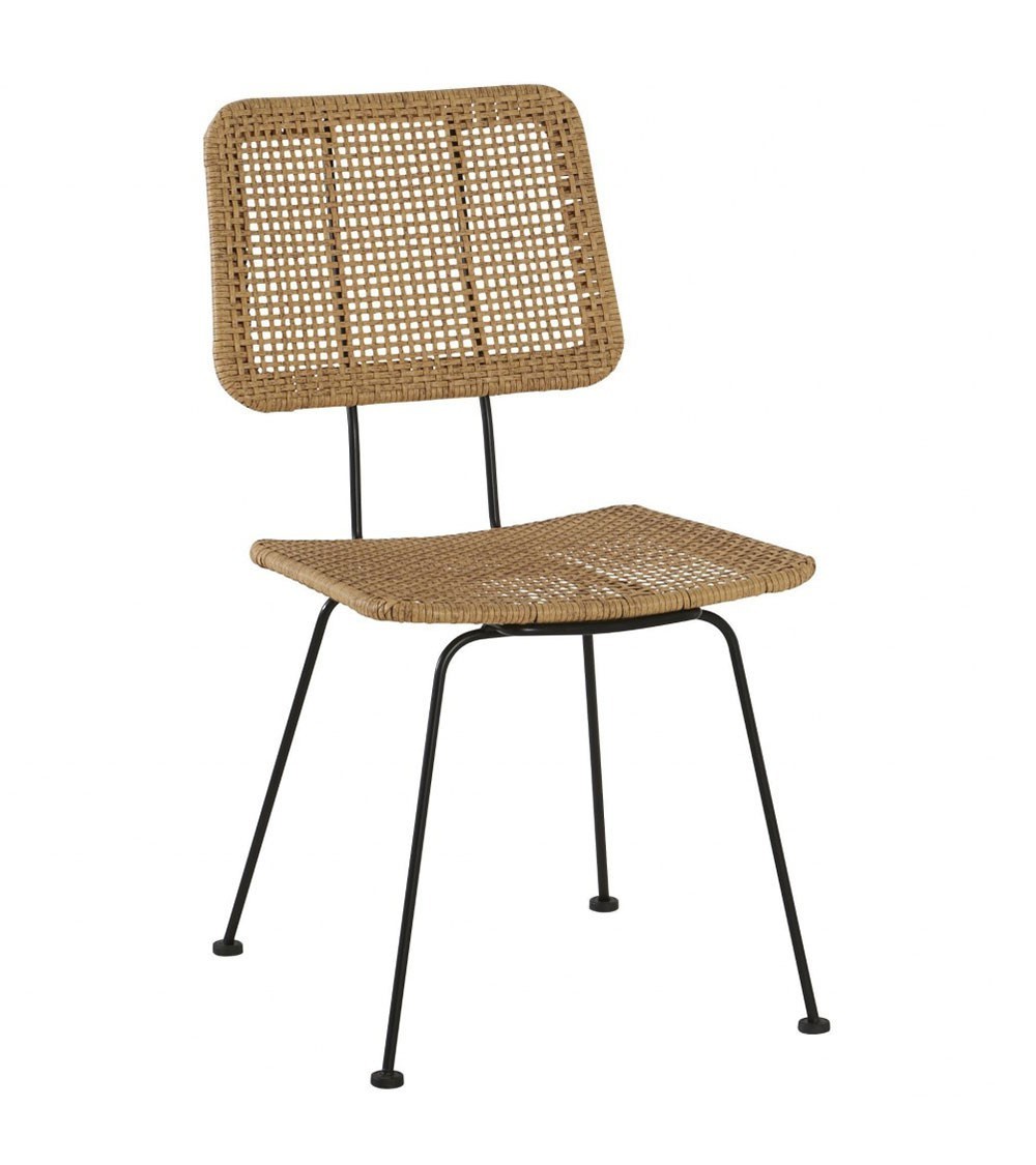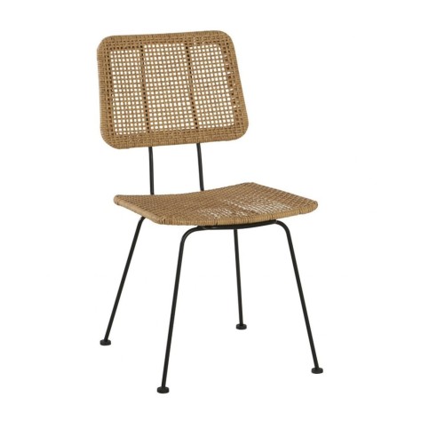 Chaise design et bohème grâce à la combinaison de son assise et dossier en imitation osier et de sa structure en métal noir.