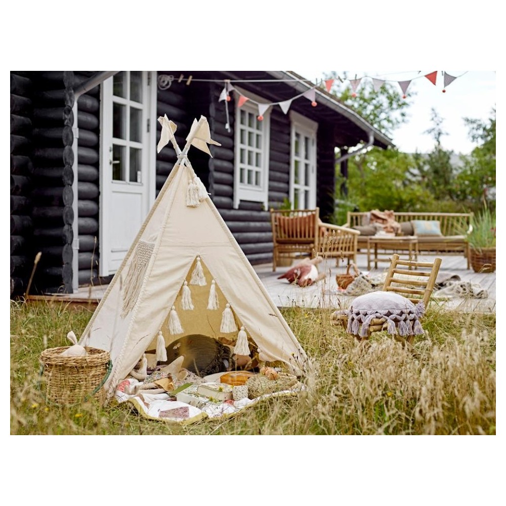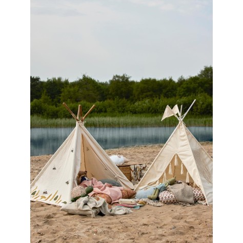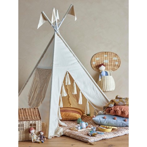 "C'est parti pour d'innombrables heures de jeux avec cette tente tipi en coton. Parfaite pour la déco d'une chambre d'enfant, elle permettra accessoirement d'y ranger quelques peluches et coussins qui traineraient. Temps calmes, entre lecture et siestoune, temps forts, à imaginer et vivre mille et une histoires, cette tente sera la cabane préférée des enfants.