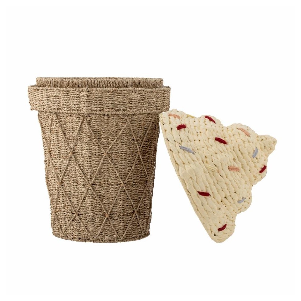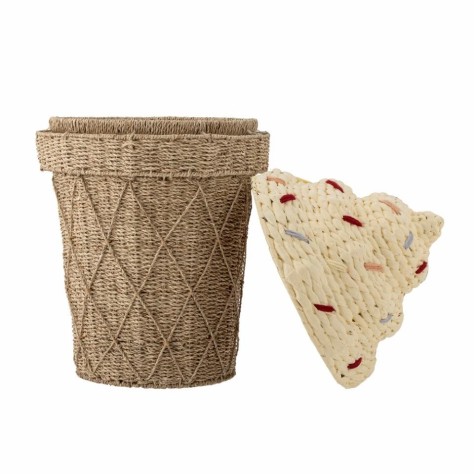Panier avec couvercle représentant une jolie glace au cornet gaufré et nappé de vermicelles arc en ciel sur le dessus. Ce panier amusant et pratique offre un grand espace de rangement pour tous les objets préférés de l'enfant, apportant une touche ludique et décorative à la chambre d'enfant. Le panier en forme de glace est doté d'un couvercle facile à retirer, permettant aux petites mains d'accéder facilement aux jouets et peluches et de les ranger à nouveau.