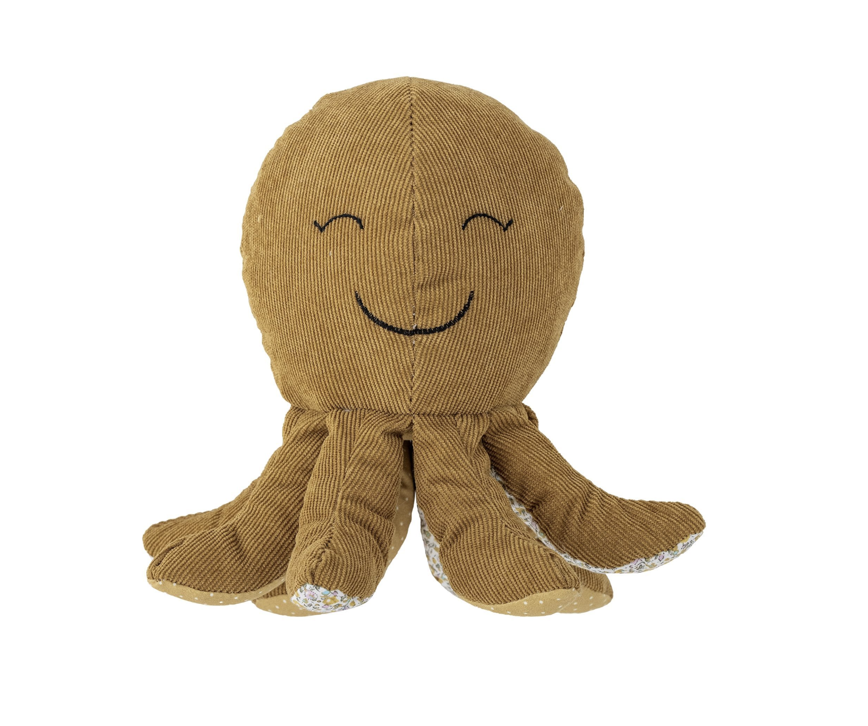 Cette peluche, douce et jolie avec son beau sourire, à toutes les chances de devenir l'élue de votre enfant. Velours côtelé sur le dessus, tissu à motif all over à fleurs et à pois sous les tentacules.