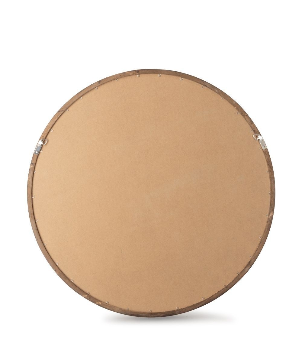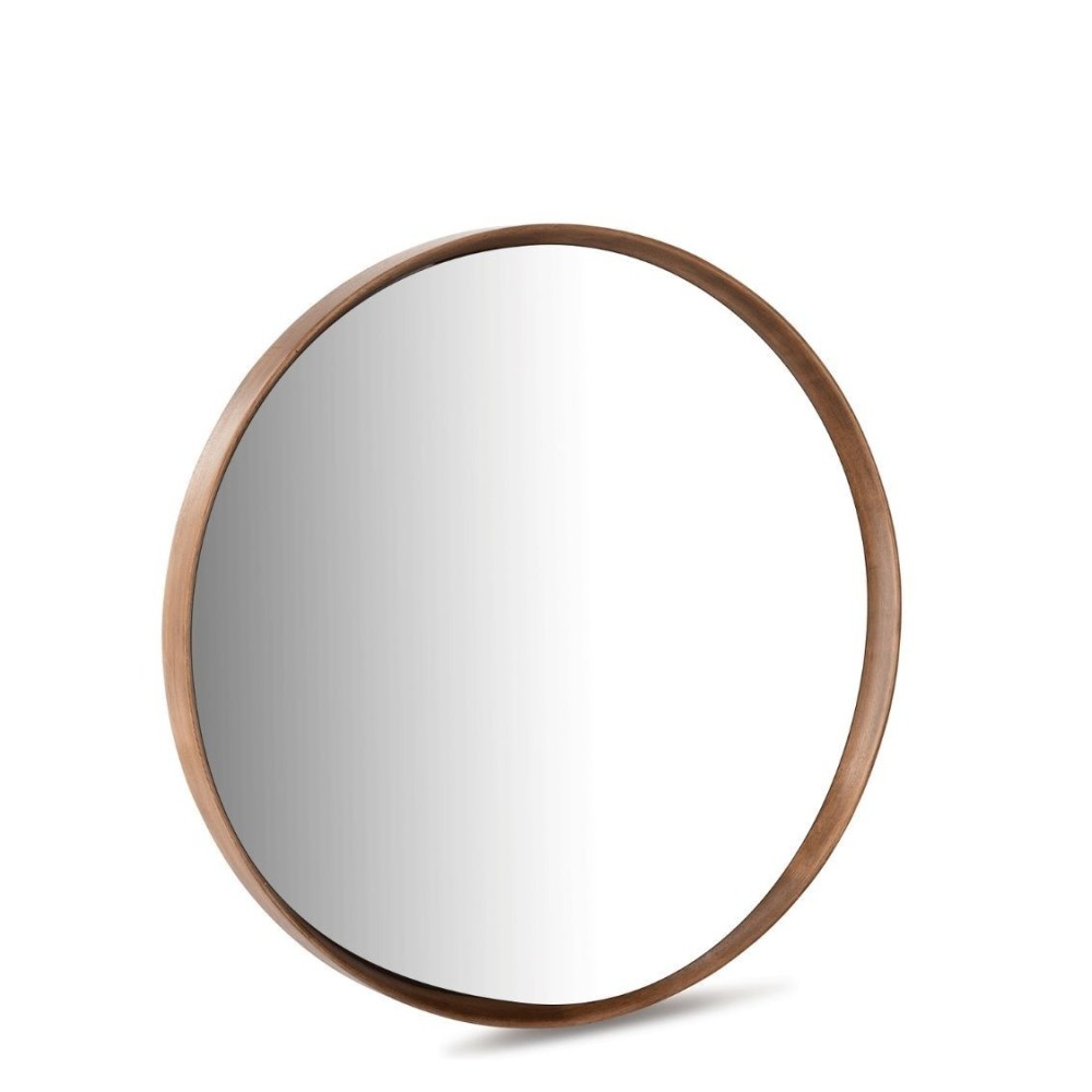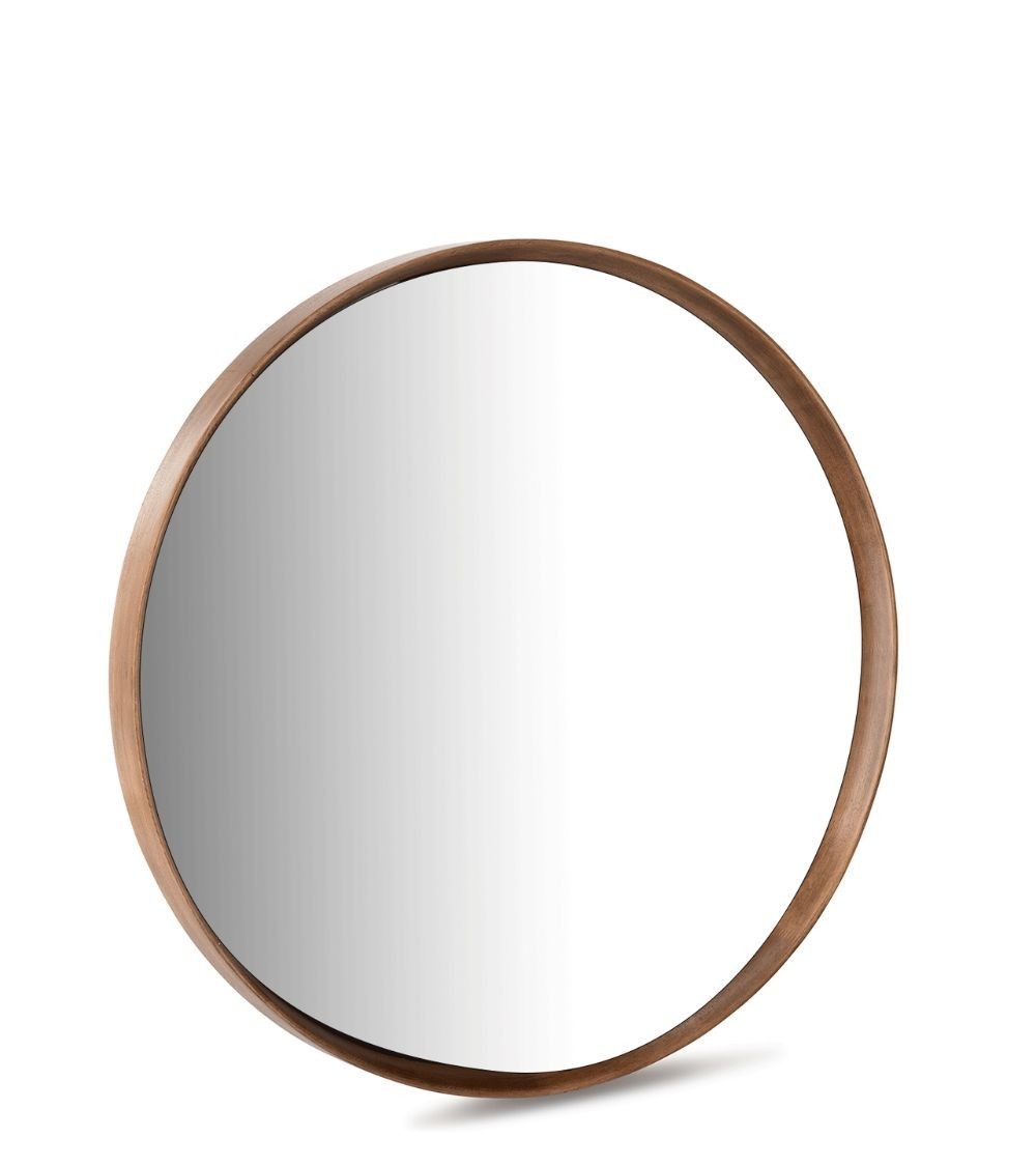 Miroir à bord large en bois de noyer couleur noisette. À poser seul ou en duo avec son petit frère de diamètre 80 cm pour encore plus d'effet.
