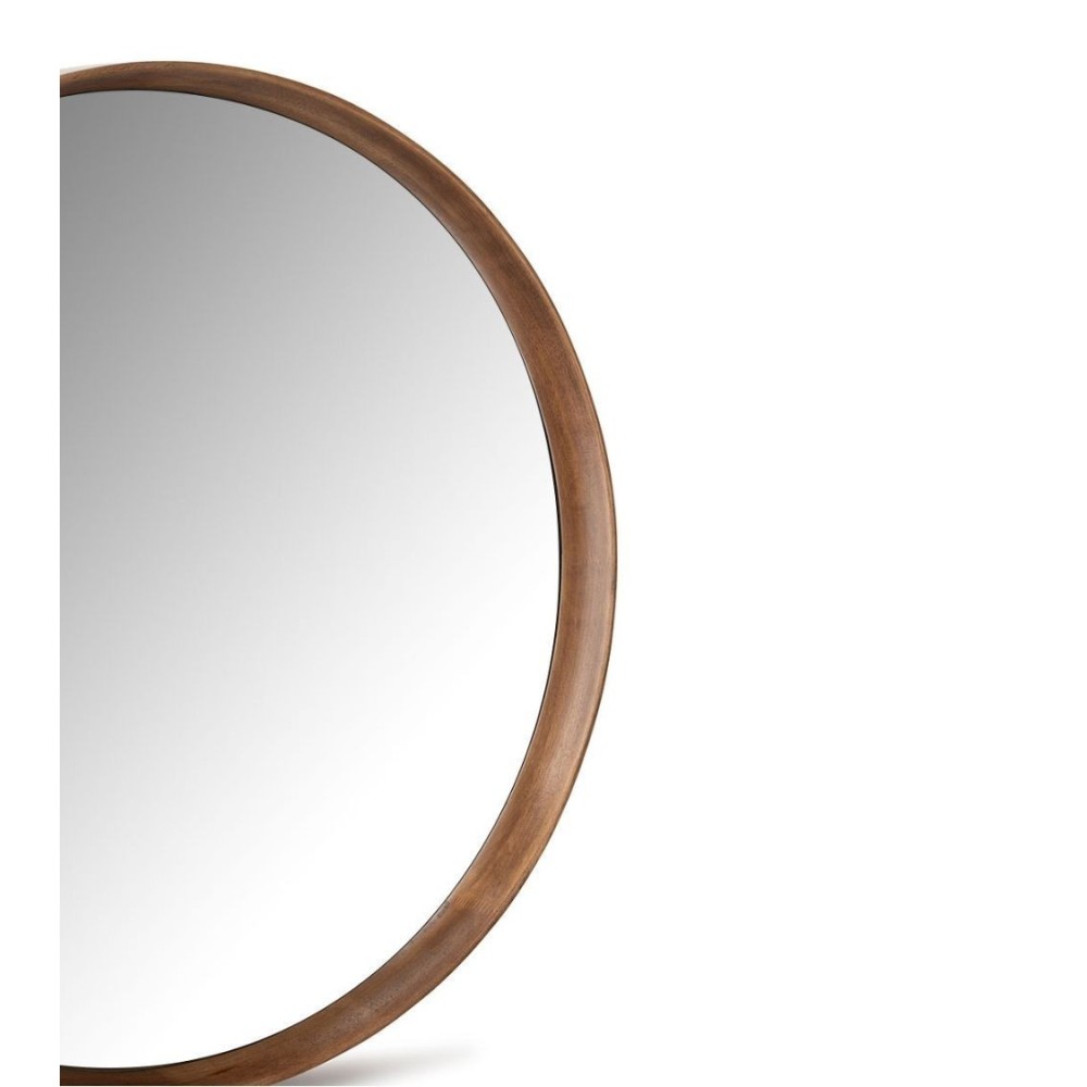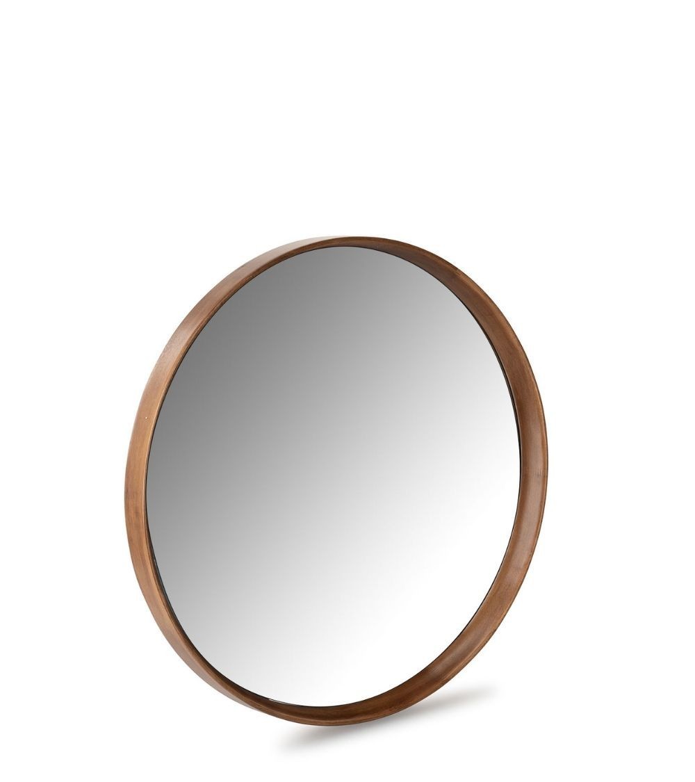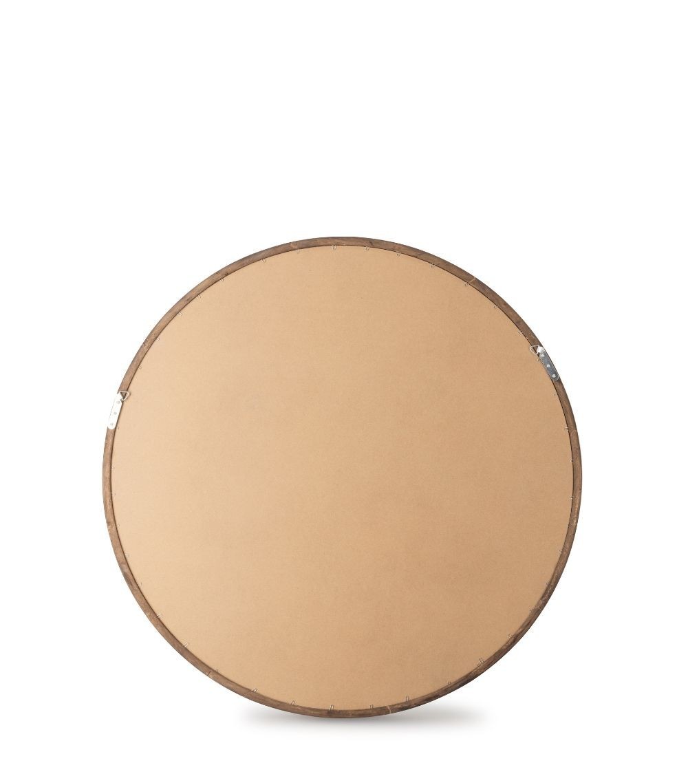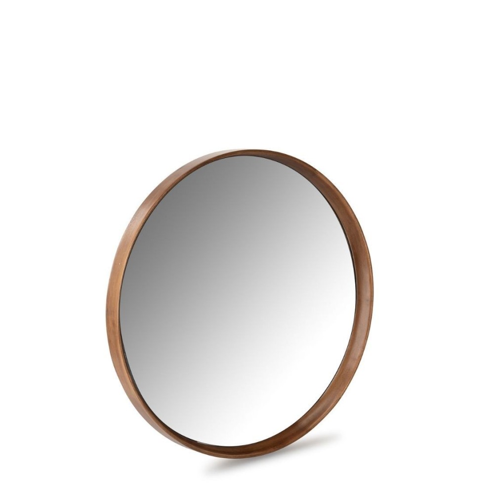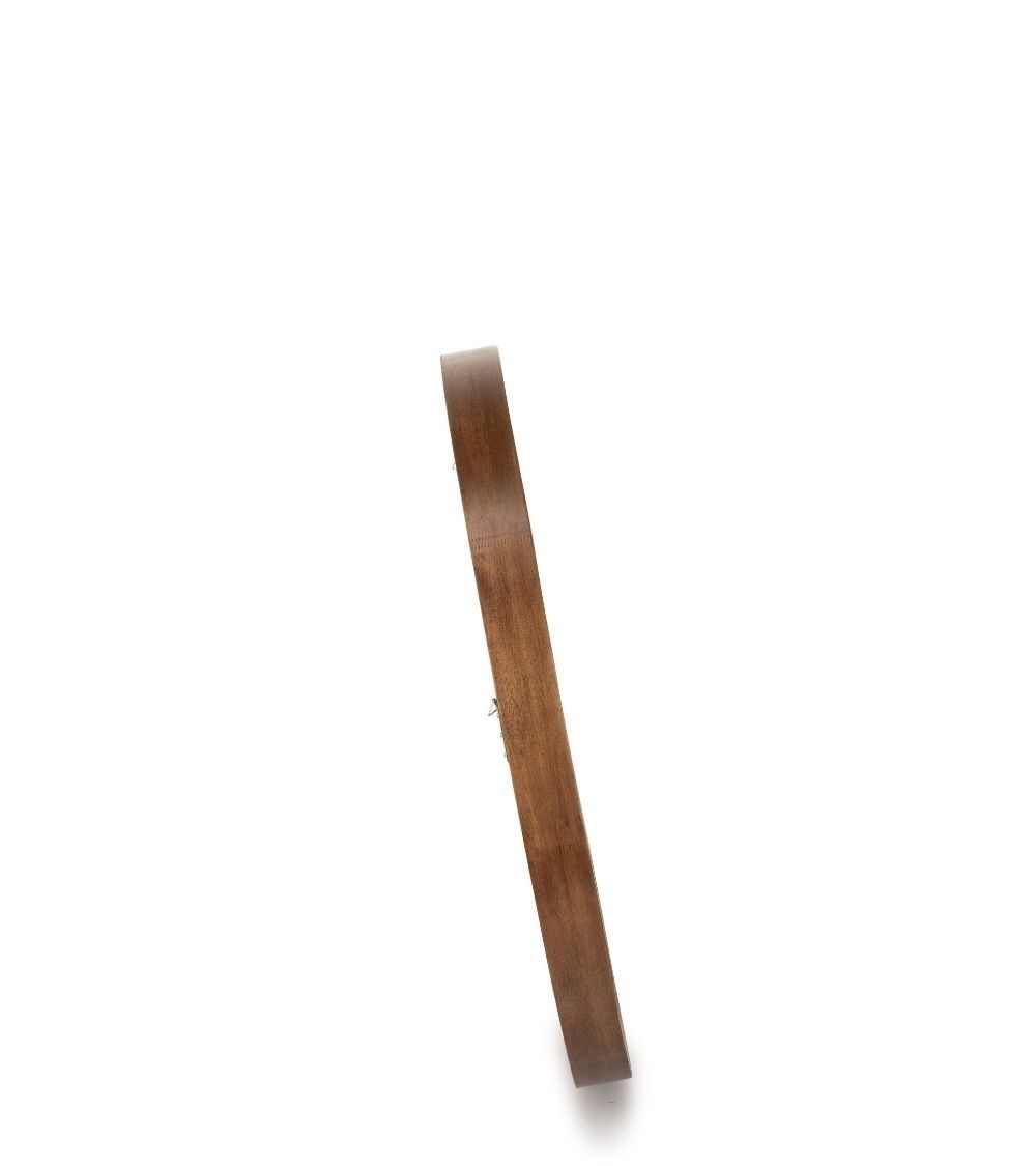 Miroir à bord large en bois de noyer couleur noisette. À poser seul ou en duo avec son grand frère de diamètre 100 cm pour encore plus d'effet.