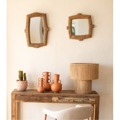 Dans la lignée de son acolyte carré, le miroir Guadalupe se décline en version rectangulaire pour varier les plaisirs et les compositions. On y retrouve l'ADN qui fait le succès de cette collection : un cadre sculptural et puissant, taillé dans un bois recyclé qui a vécu. Chaque pièce est absolument unique, avec sa propre patine, ses fissures et ses nuances qui lui confèrent une âme inimitable. Sa forme verticale et ses contours bruts, presque comme des fragments de branches, en font un objet à la frontière de l'artisanat tribal et de la sculpture. C'est la pièce parfaite pour apporter de la texture et une touche d'authenticité à un mur.