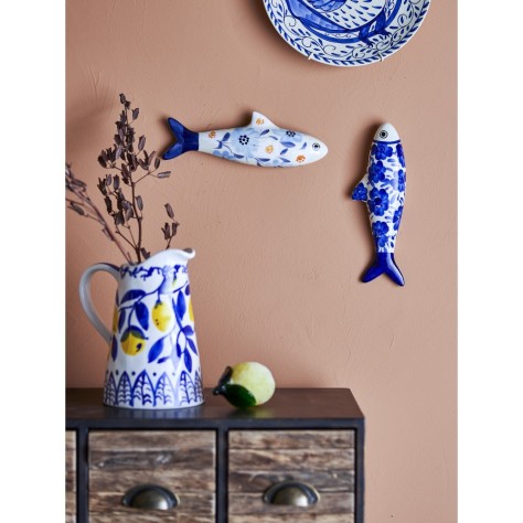 Charmant ensemble de deux poissons décorés à la main en grès. Inspirées par l'ambiance colorée de la Méditerranée, ces décorations peuvent être accrochées au mur ou placées comme éléments décoratifs sur la table. Chaque poisson est orné de motifs floraux uniques, apportant une touche personnelle et artistique à n'importe quelle pièce.
