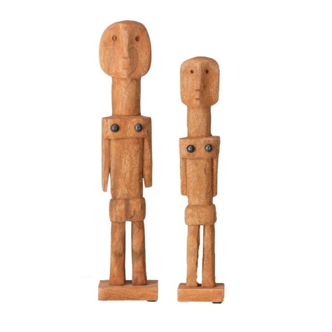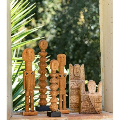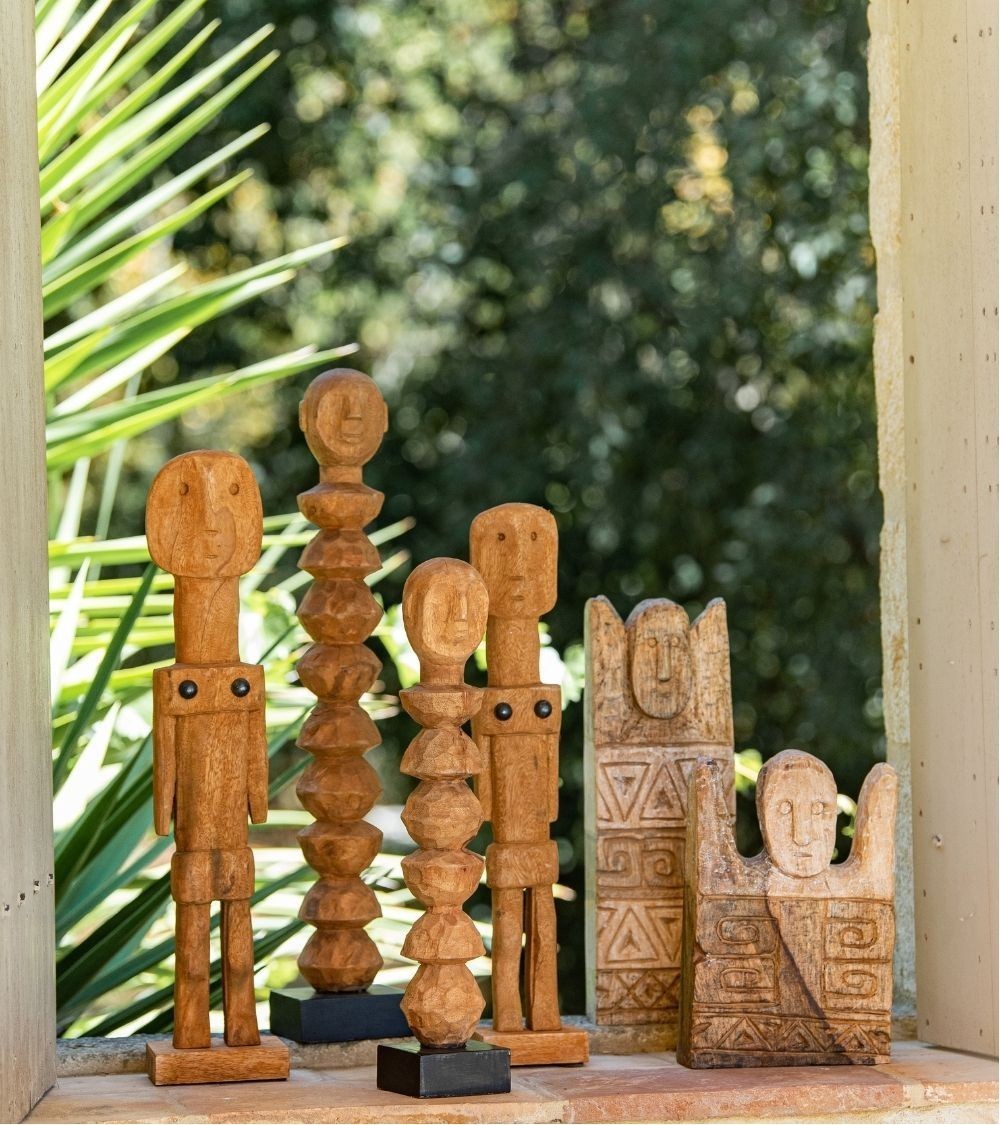 Plus que des objets, une présence. Nos statues Ancêtres sont des pièces sculpturales qui semblent chargées d'histoire et de voyages. Taillées dans du bois de manguier massif, leurs silhouettes abstraites et longilignes sont une réinterprétation moderne de l'art primitif et des idoles anciennes. La finition naturelle du bois, brute et authentique, laisse apparaître le grain de la matière et apporte une chaleur incomparable. Présentées en duo de tailles complémentaires (65 et 59 cm), elles créent un dialogue visuel, comme deux gardiens bienveillants et silencieux. Ce sont des pièces fortes qui insufflent un supplément d'âme et une dimension artistique à un intérieur.