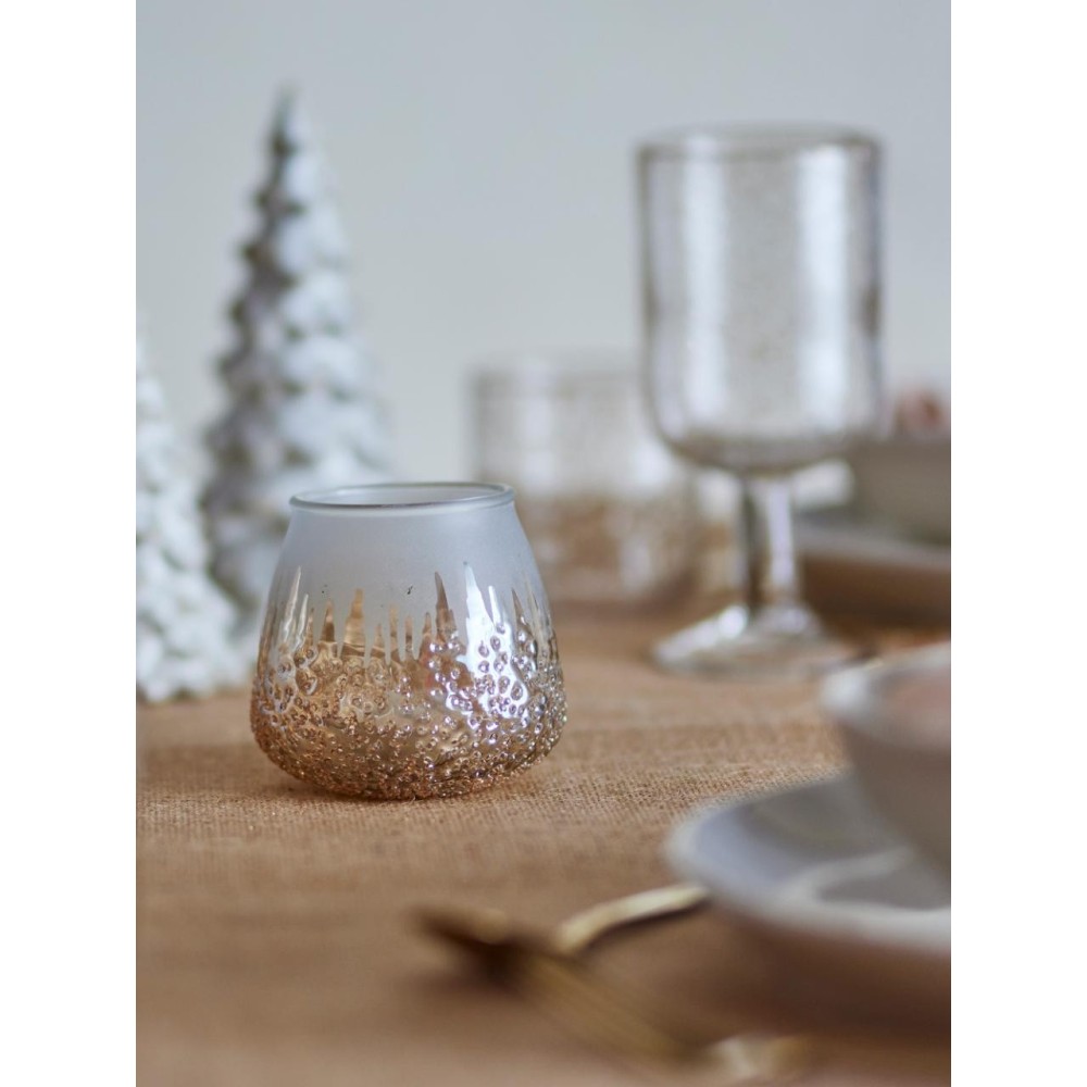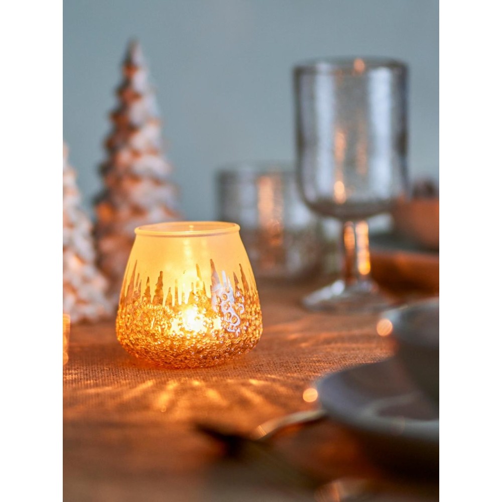 Le photophore Feniah de Bloomingville a un aspect givré et est orné de détails dorés, créant un bel éclairage dans la pièce lorsqu'une bougie chauffe-plat y est placée. Le porte-bougie est fabriqué en verre recyclé, ce qui lui donne un aspect totalement unique. Il constitue un bel ajout à votre maison, que vous l'utilisiez avec ou sans bougies.