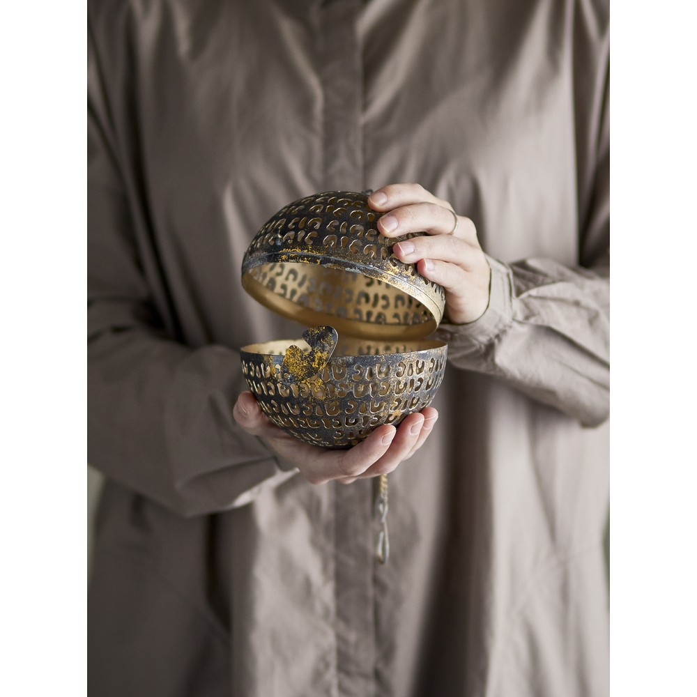 Illuminez votre intérieur avec cette boule décorative en métal, un objet lumineux versatile. Son design ajouré permet de diffuser une lumière tamisée et créera une atmosphère douce et accueillante. Ouvrez-la facilement pour y glisser une petite bougie LED ou une mini guirlande lumineuse pour un effet scintillant. Idéale à poser un meuble, une étagère ou en centre de votre table basse, elle peut aussi se suspendre à une échelle en bambou ou sur un mur. Cette décoration lumineuse s'intègre à tous les styles et apporte une touche antique et ethnique, dans une chambre ou un salon.