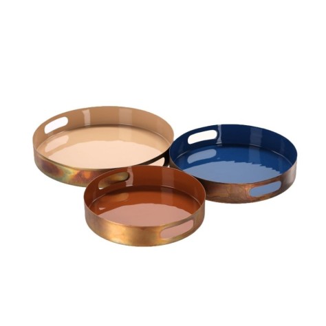 Organisez et sublimez votre intérieur avec ces plateaux ronds alliant un extérieur en métal cuivré artisanal à un intérieur laqué de couleur vive.