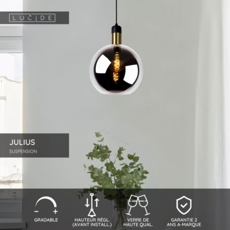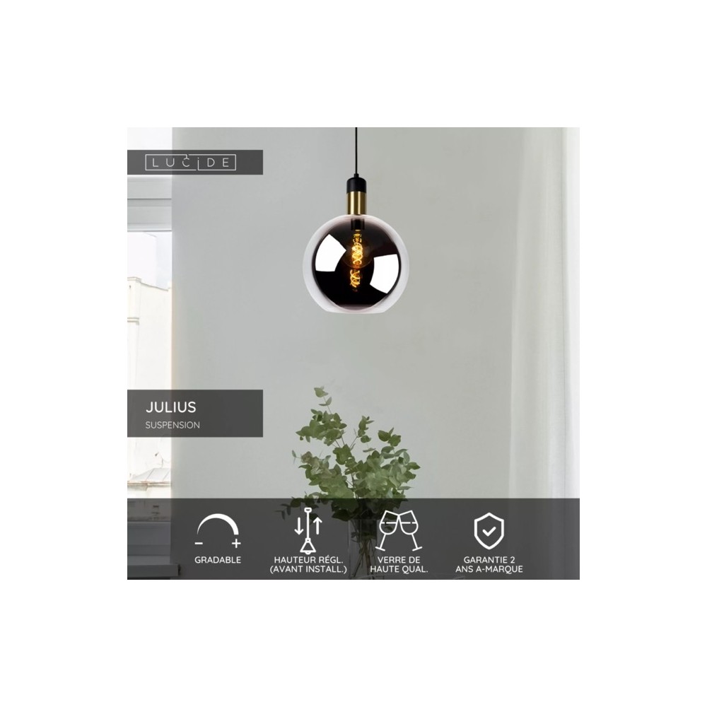 Illuminez votre intérieur avec la suspension Julius, une sphère design de 28 cm en verre fumé et laiton, parfaite seule ou en composition pour un style contemporain.