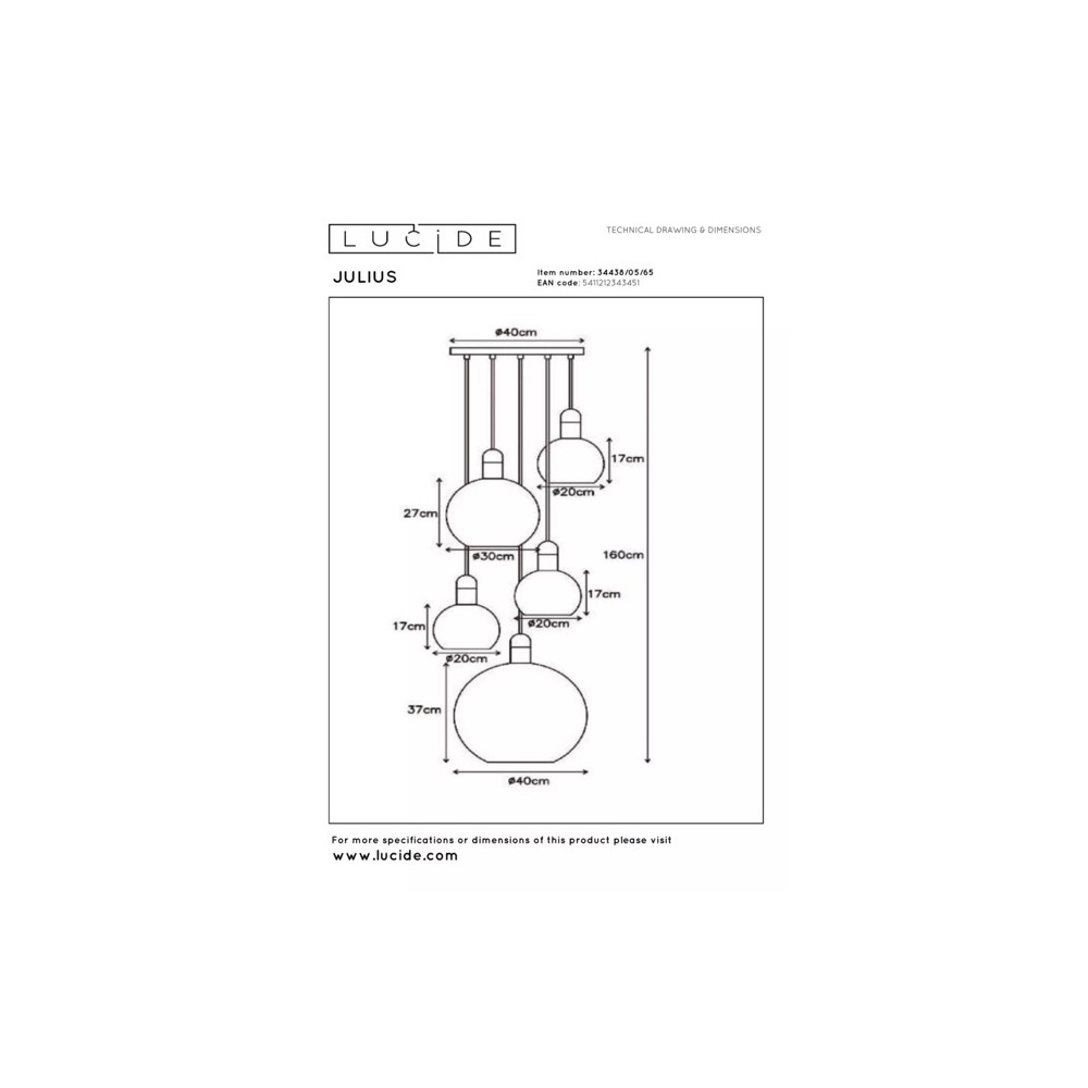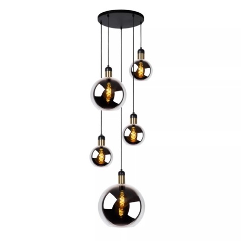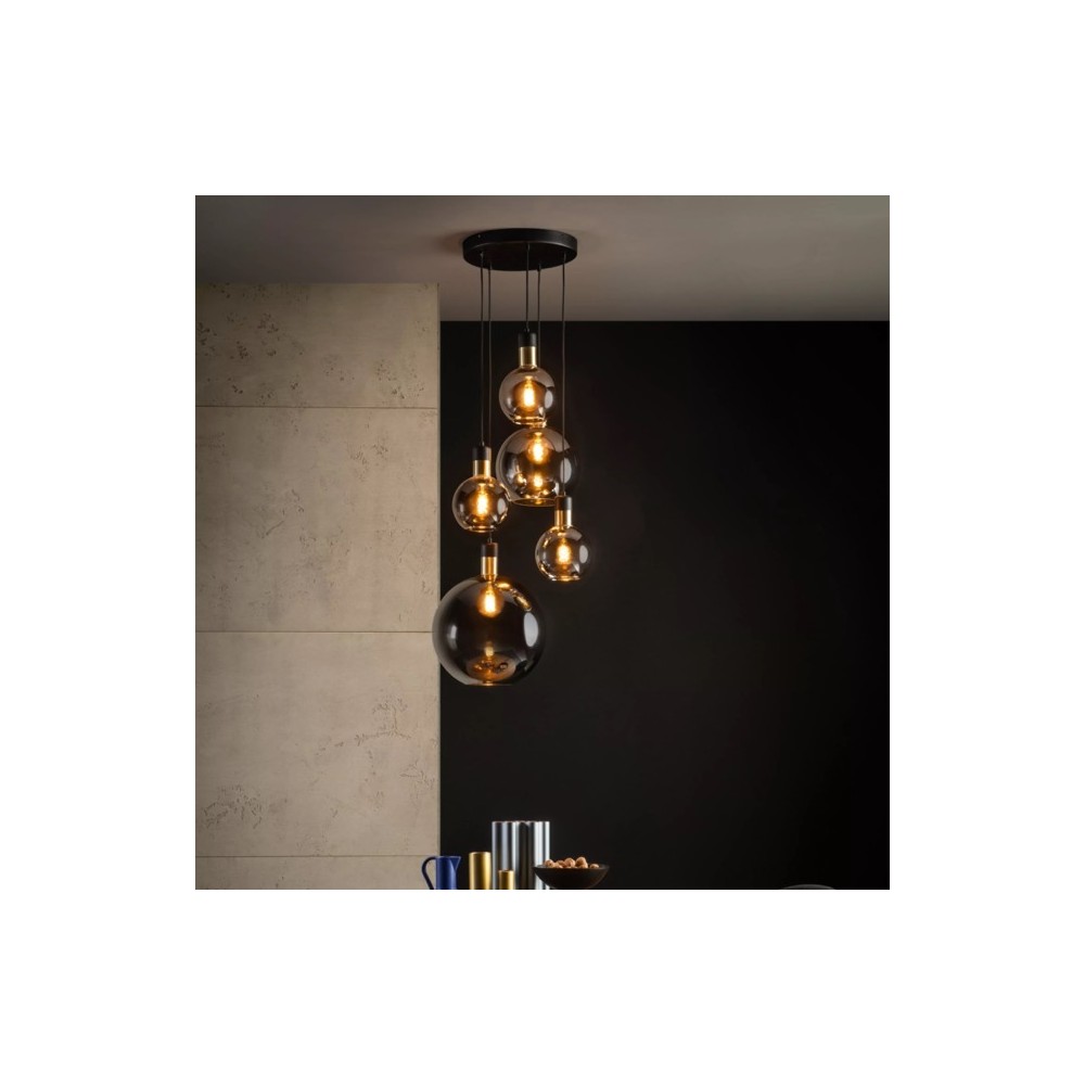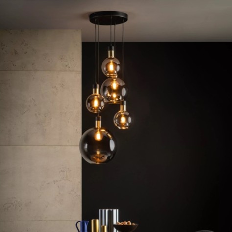 Créez un point focal avec le lustre cascade Julius, une grappe de cinq globes en verre fumé suspendus à différentes hauteurs pour un effet de mouvement saisissant.