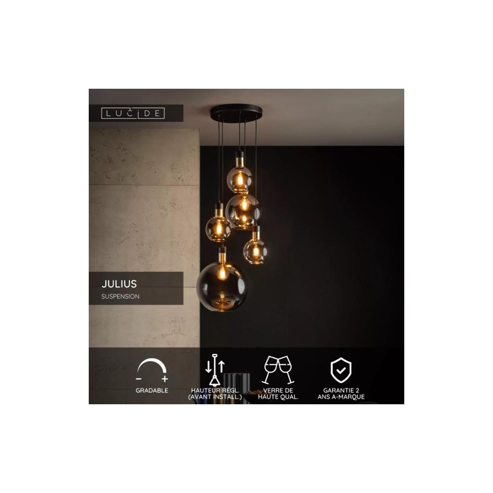 La collection Julius atteint son apogée avec cette interprétation en lustre cascade. C'est une véritable sculpture lumineuse, une pluie de sphères réfléchissantes conçue pour habiller les grands volumes avec une élégance théâtrale. Depuis un pavillon rond unique, cinq globes en verre fumé de tailles différentes descendent en une composition asymétrique et aérienne. Chaque sphère joue indépendamment avec la lumière et les perspectives. L'ensemble crée un mouvement visuel permanent, une constellation de reflets qui évolue au gré de votre position. La finition bicolore noir et dorée de chaque monture apporte des points de lumière chaude au sein de cette composition.