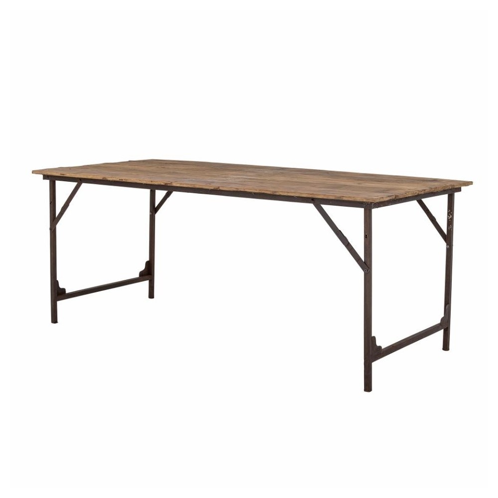 Aspect brut et naturel. Le plateau est en bois recyclé et le cadre est en métal noir. Les pieds sont pliables pour un rangement facile.