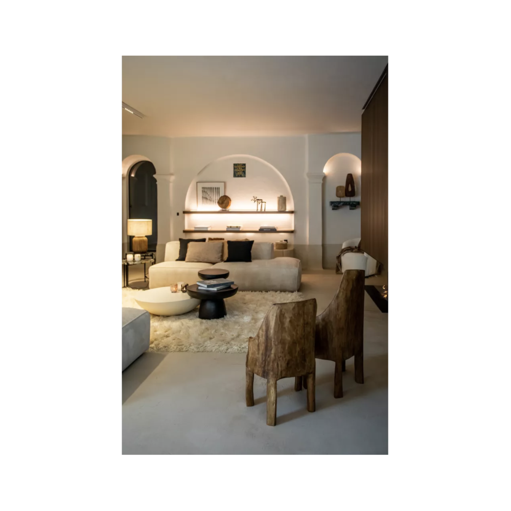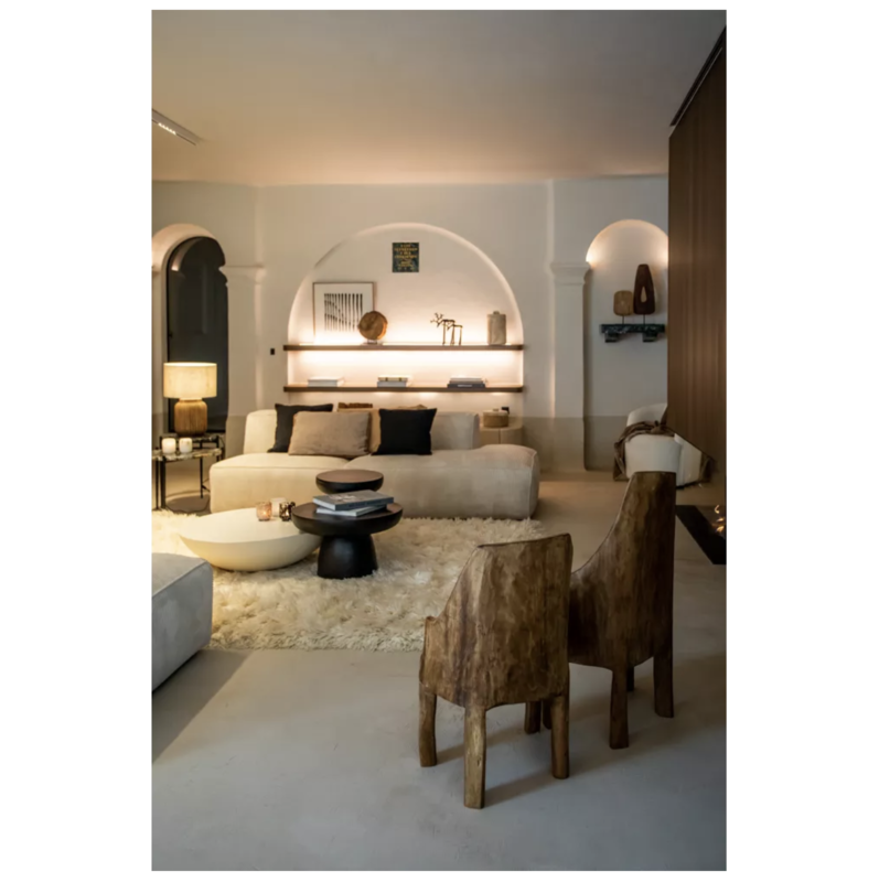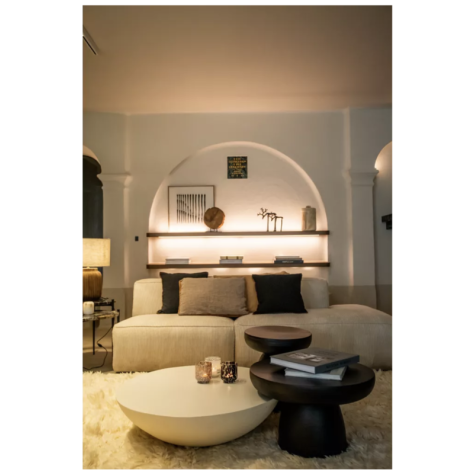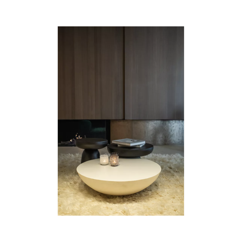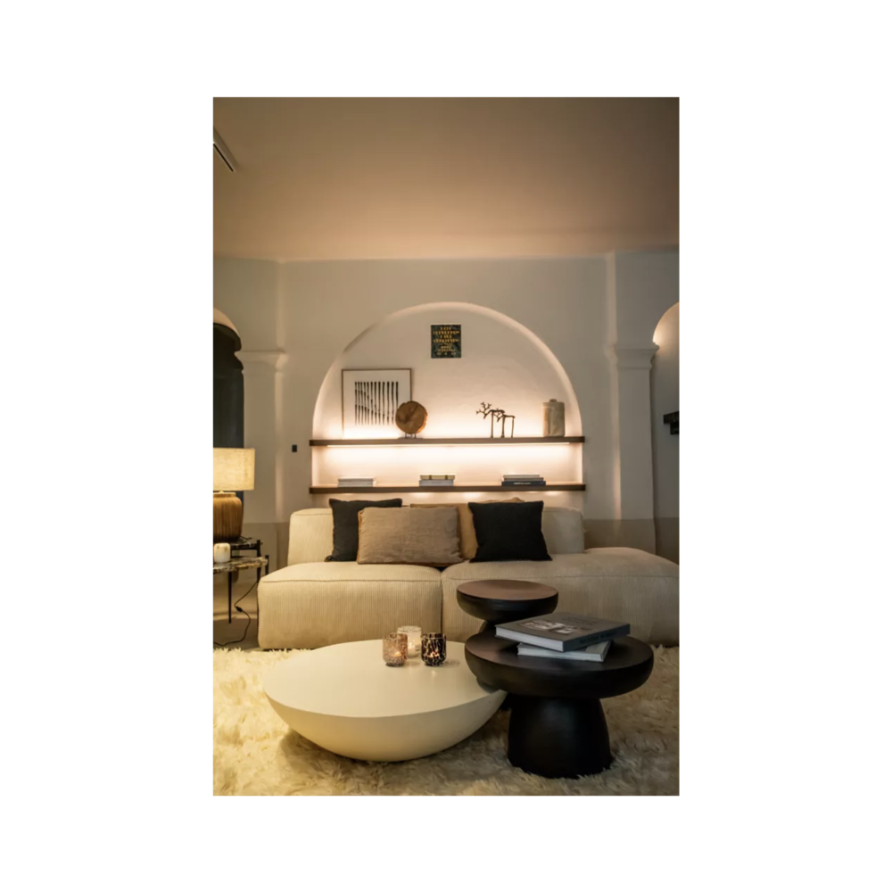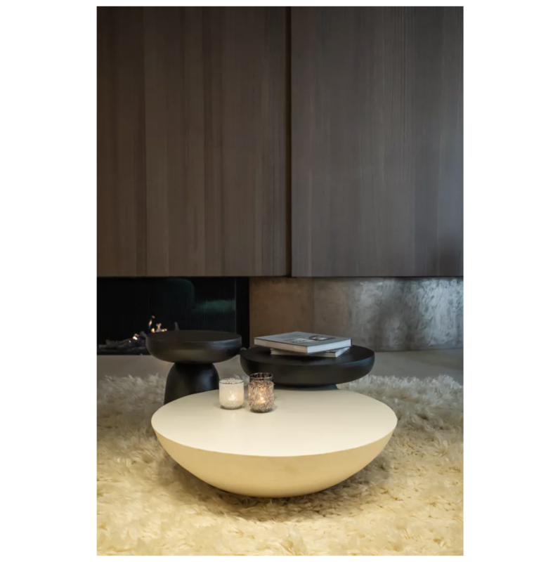 Pour un effet de composition très design, associez là à d'autres tables basses de différentes hauteurs. Ce jeu de volumes crée un dynamisme digne des plus beaux magazines de décoration. Elle est la pièce maîtresse d'un intérieur Wabi-Sabi ou d'inspiration méditerranéenne. Placez-la sur un grand tapis moelleux pour jouer sur le contraste des textures. Son blanc minéral s'harmonise à la perfection avec le beige du lin, le cognac du cuir et le vert des plantes d'intérieur.