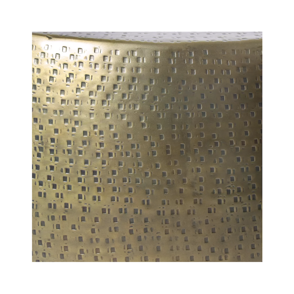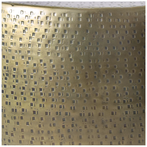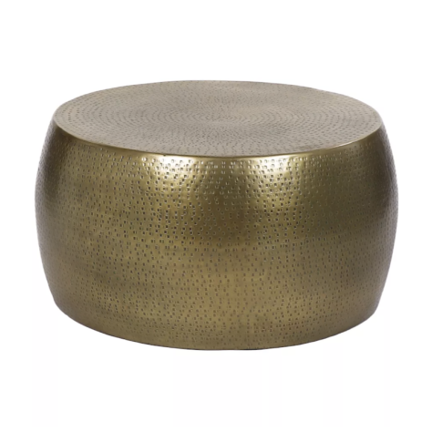 Table basse en aluminium martelé à la main puis colorée d'un chaleureux doré lui conférant au final un look bohème, ethnique et antique.