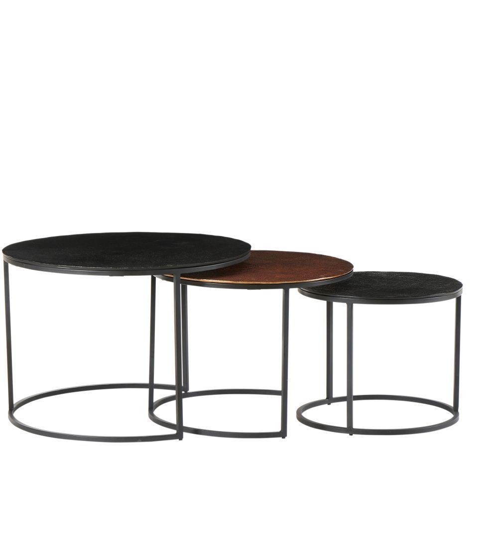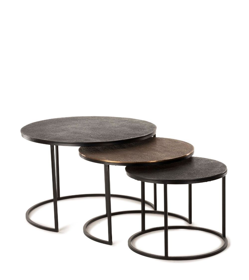 Jouez avec les volumes et les matières grâce au set de 3 tables basses gigognes Yuli, alliant des plateaux texturés en aluminium noir et doré à une structure en fer.