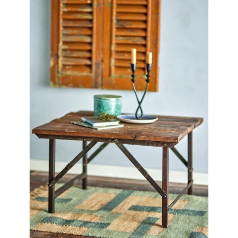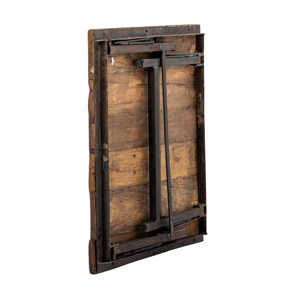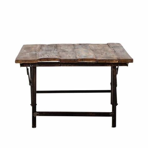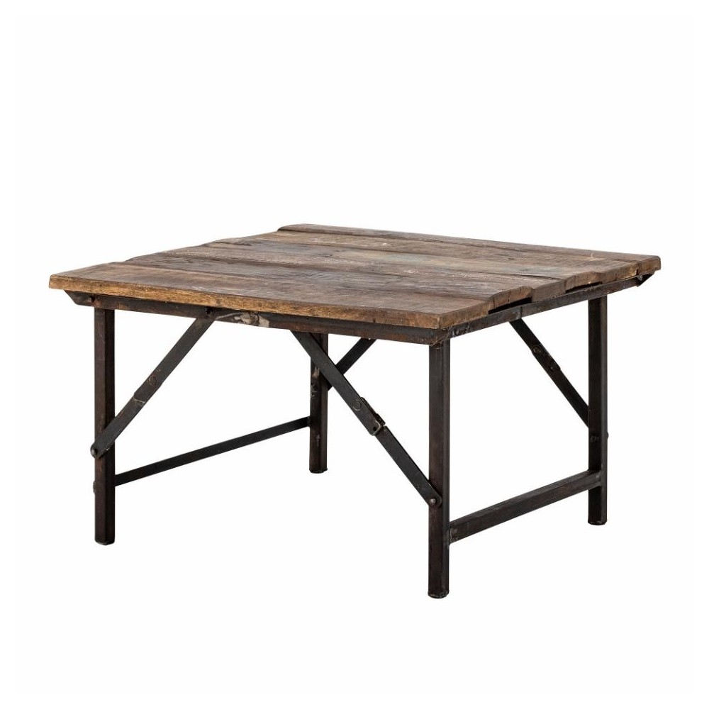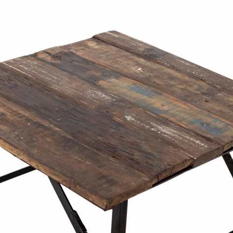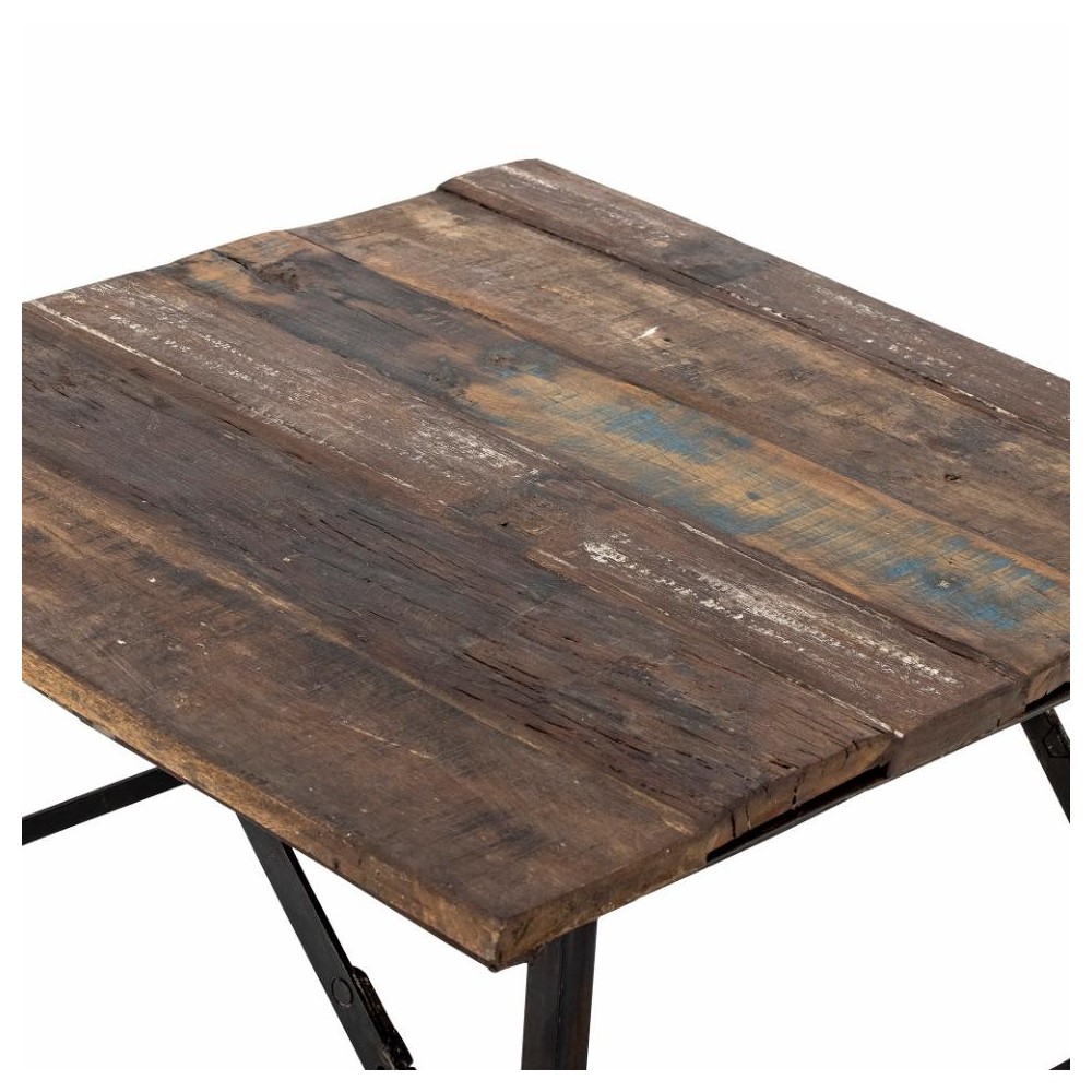 Aspect brut et naturel. Le plateau est en bois recyclé et le cadre est en métal noir. Les pieds sont pliables pour un rangement facile.