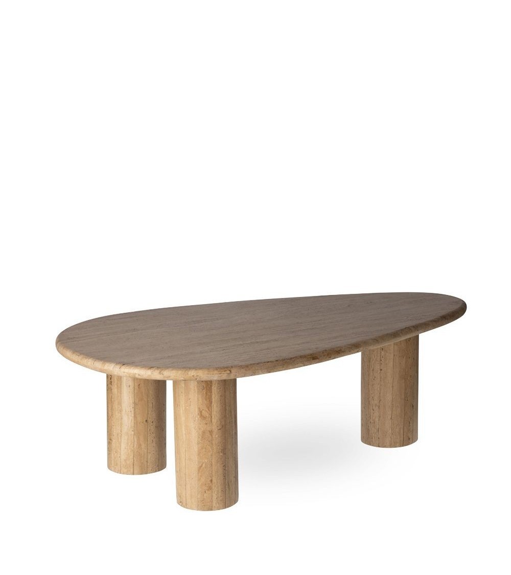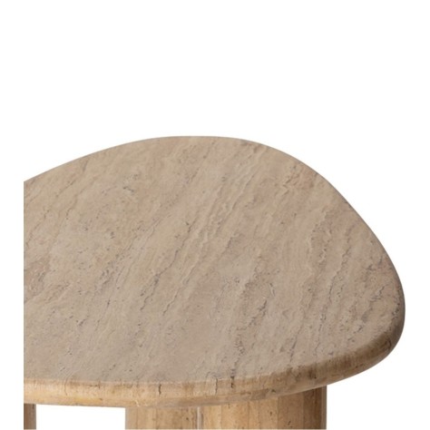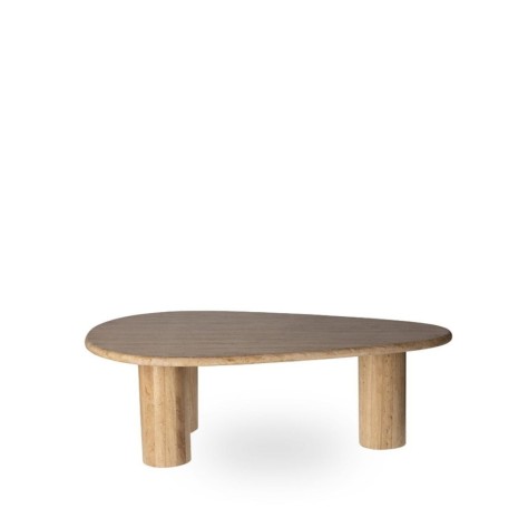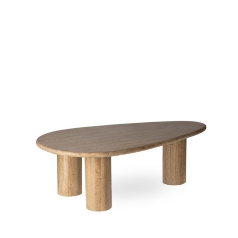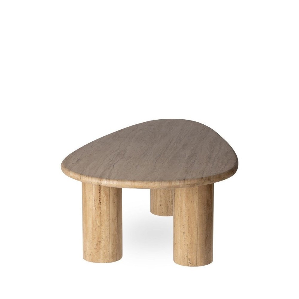 Table basse en pierre de travertin, avec plateau forme organique et trois pieds de forme cylindrique.