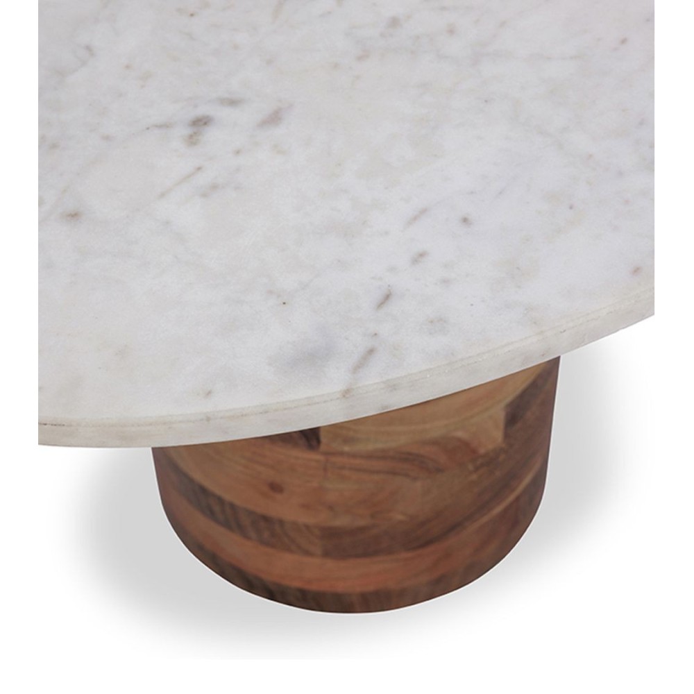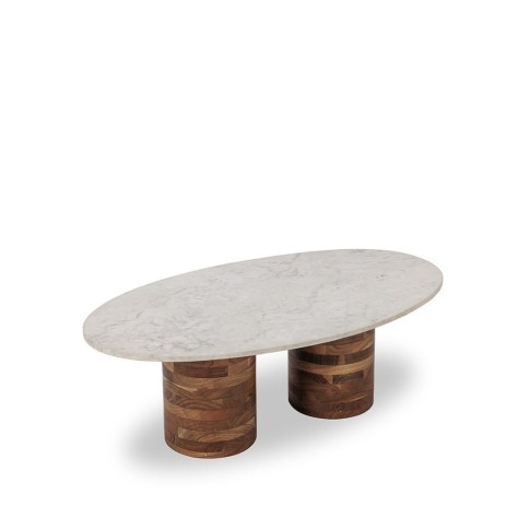 Table basse ovale avec plateau en marbre blanc et pieds ronds en bois de manguier.