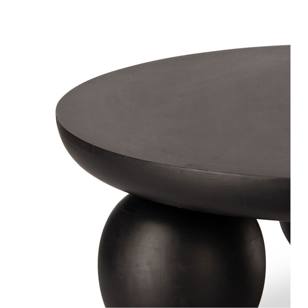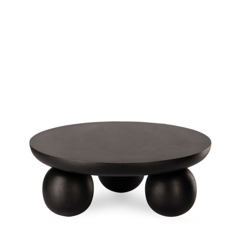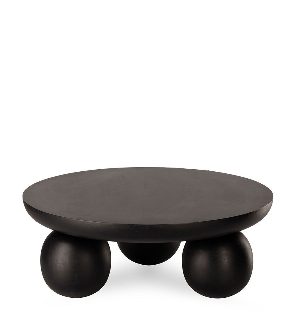 Table basse ronde en bois de manguier diamètre 90 cm avec trois pieds ronds.