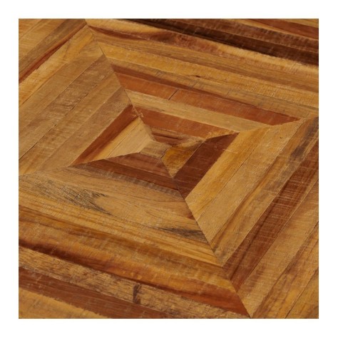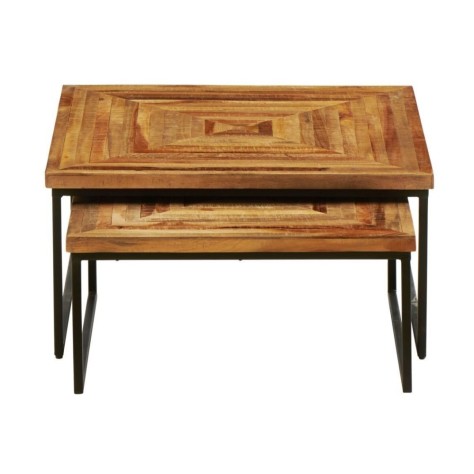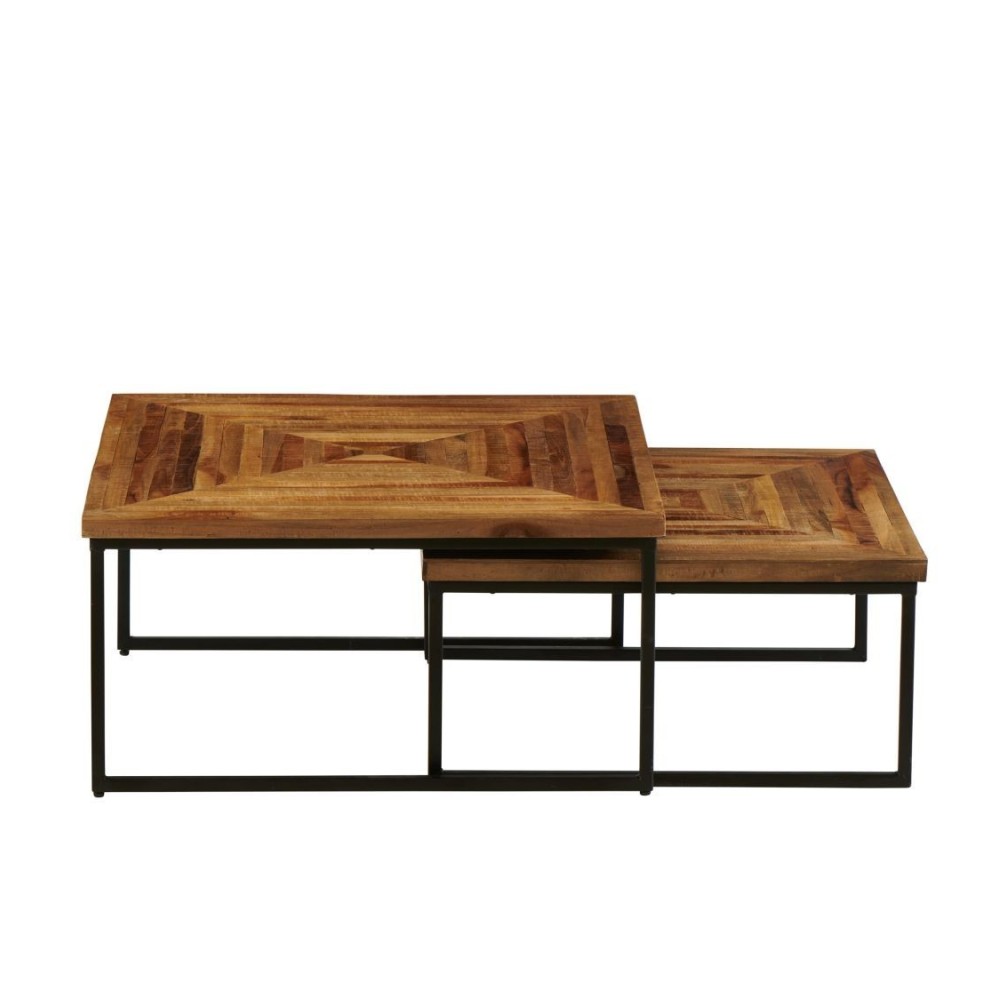 Cet ensemble de tables basses se distingue par ses deux plateaux en teck recyclé, à hauteurs variées. Ils présentent des lattes géométriques sur sa surface avec un piètement en métal noir.