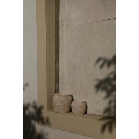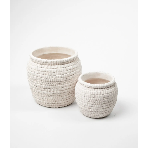 Est-ce un panier ? Est-ce de la poterie ? Le pot Rosalie est un objet surprenant qui joue avec nos sens et brouille les pistes entre les matières. Sa grande originalité est d'imiter le relief et la texture d'un panier tressé en fibres naturelles, mais il est en réalité fabriqué en ciment. Le résultat est un trompe-l'œil fascinant : l'apparence chaleureuse d'un objet artisanal dans une matière brute et contemporaine. Sa finition blanc cassé, mate et texturée, accroche la lumière avec douceur et sublime la forme de vos plantes d'intérieur.